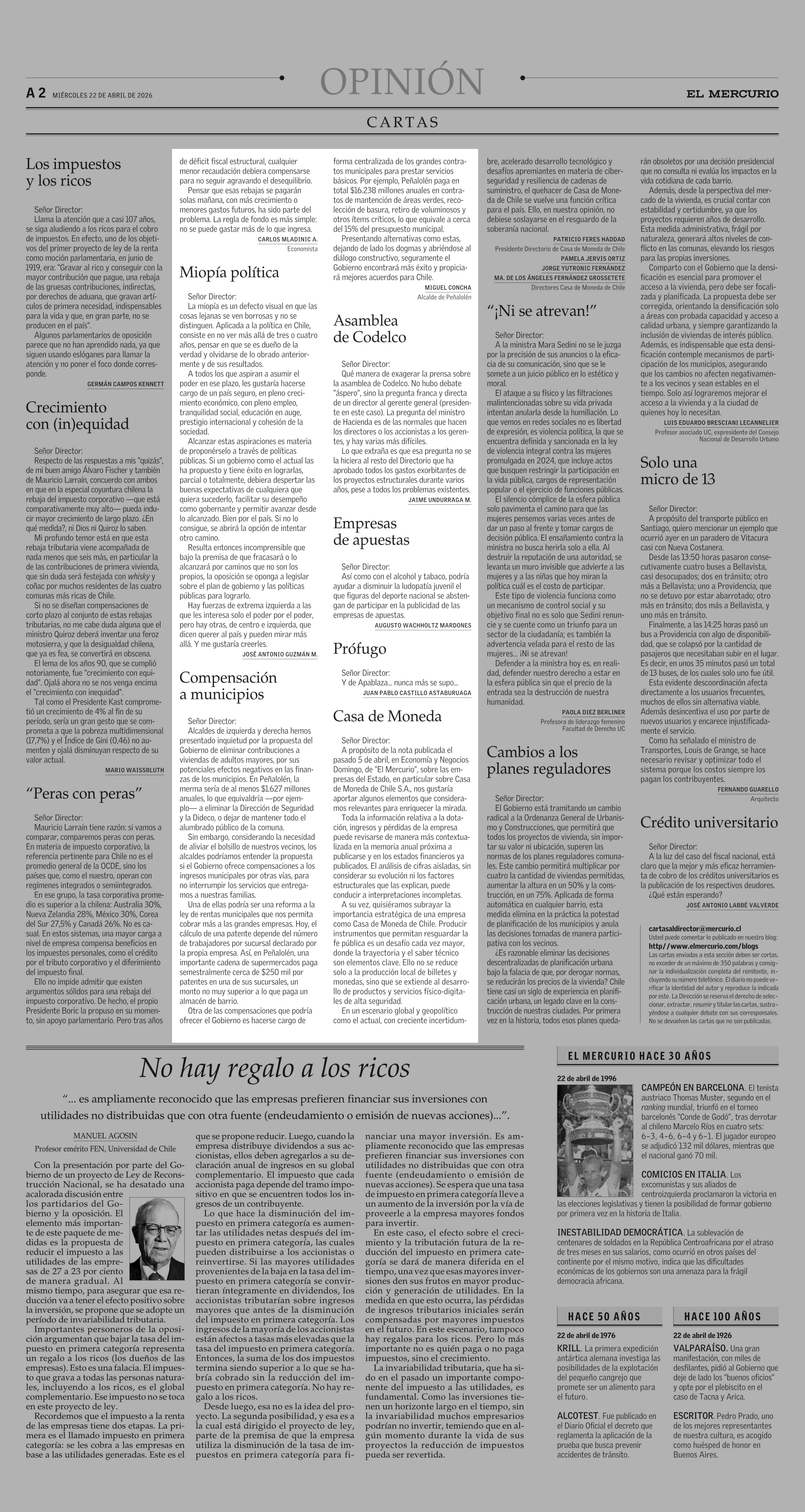 Cartas: Compensación a municipios 22-04-2026 El Mercurio |