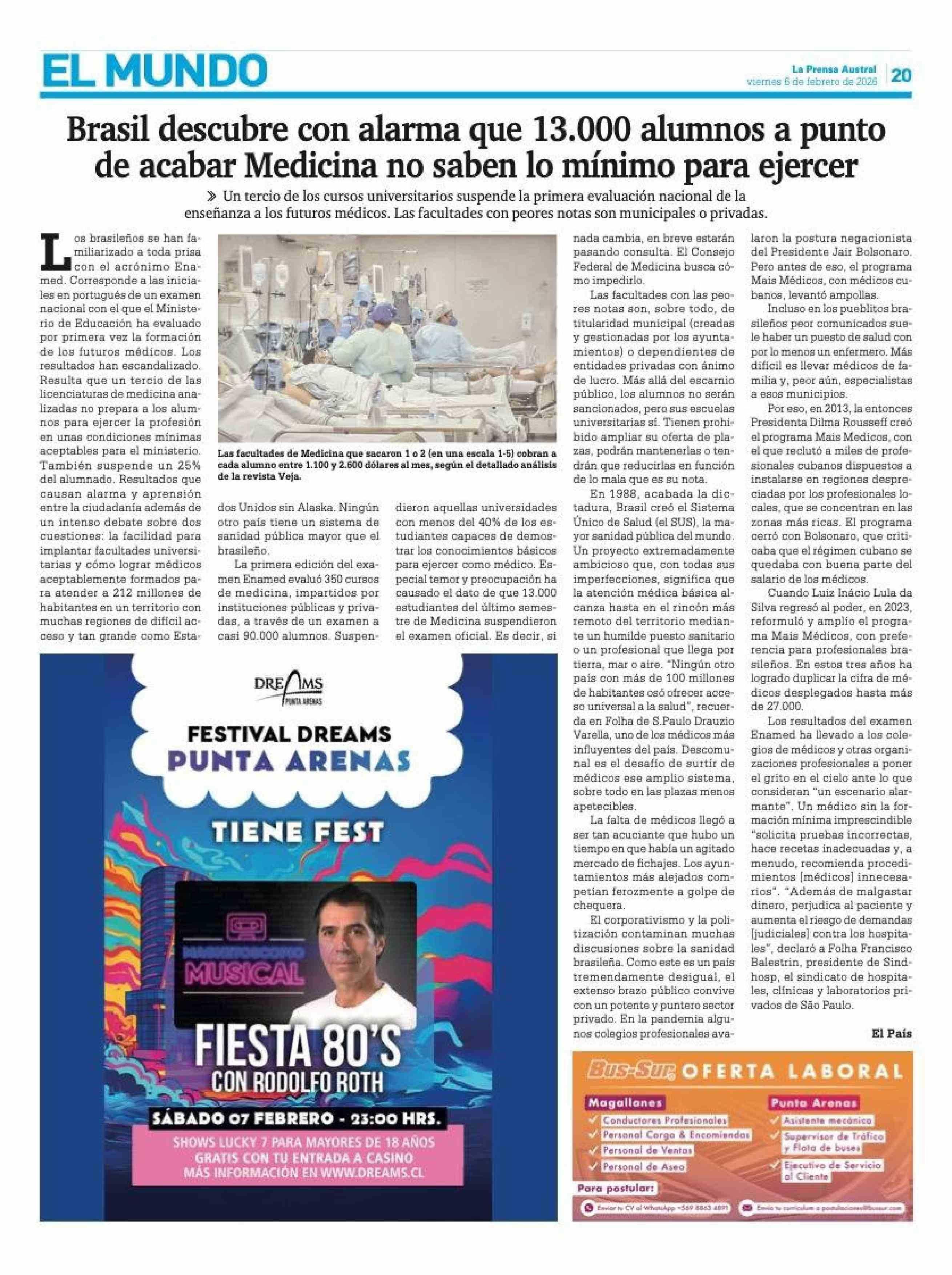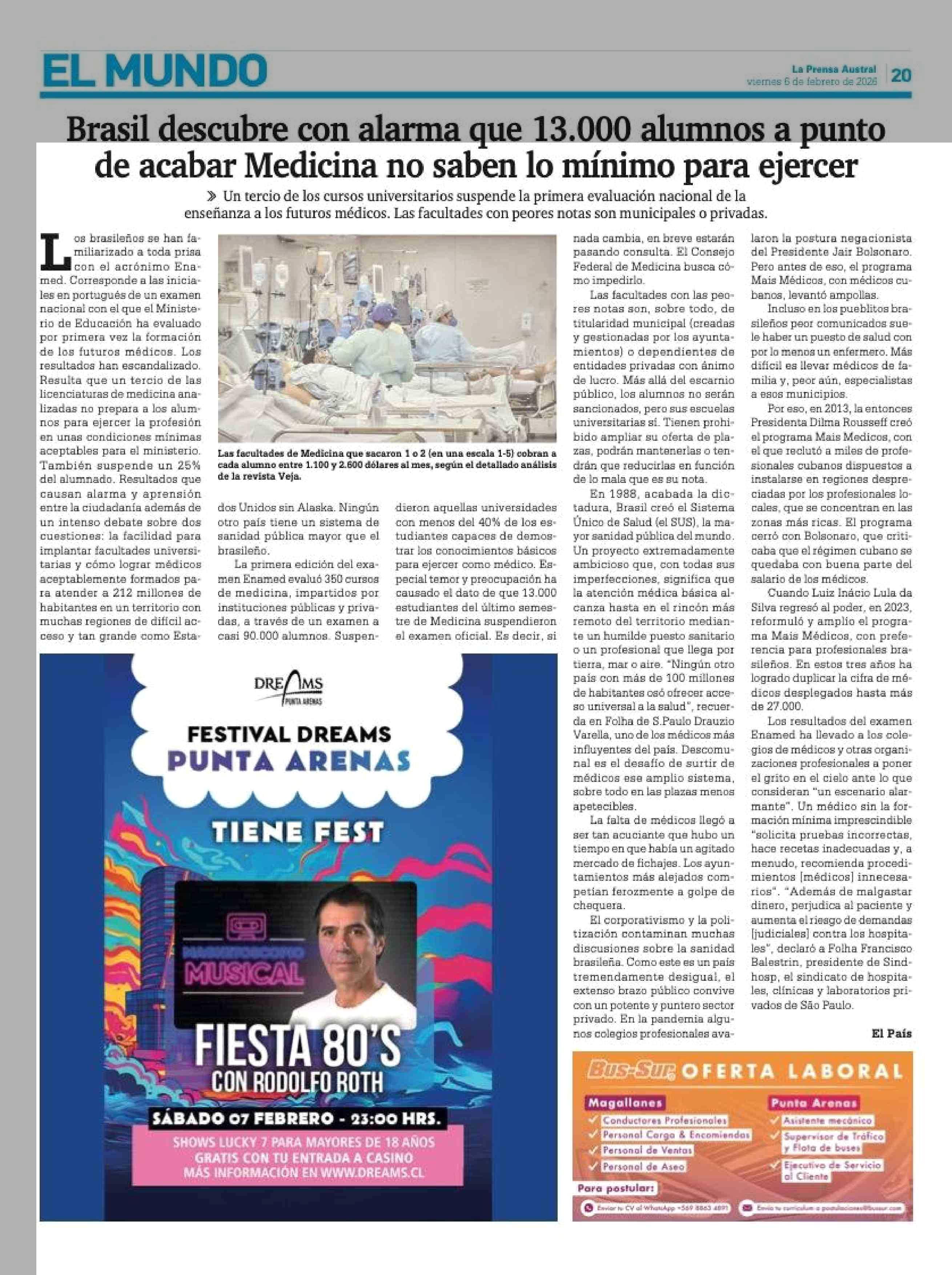 Brasil descubre con alarma que 13.000 alumnos a punto de acabar Medicina no saben lo mínimo para ejercer 06-02-2026 La Prensa Austral |