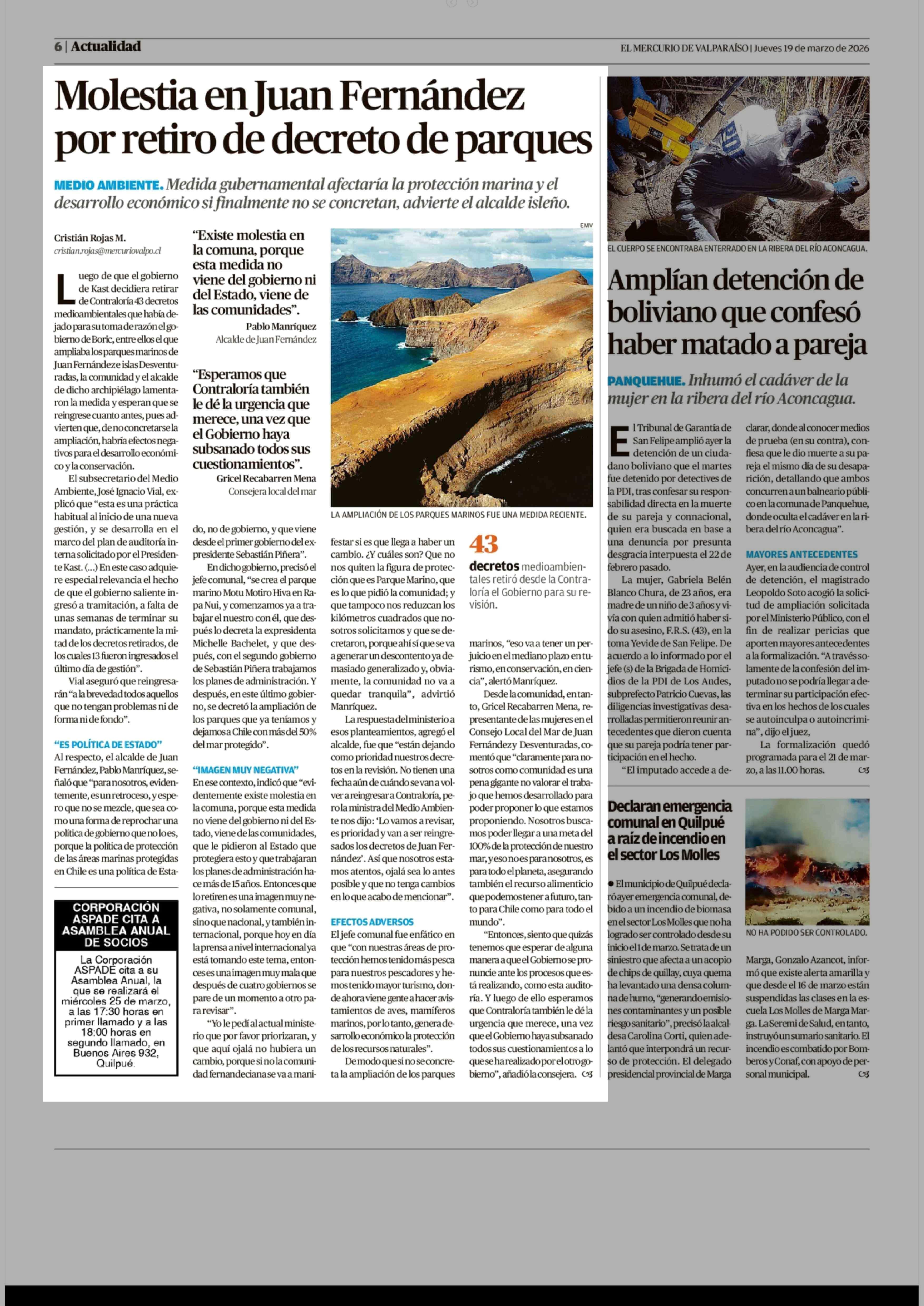 Molestia en Juan Fernández por retiro de decreto de parques 19-03-2026 El Mercurio de Valparaíso |