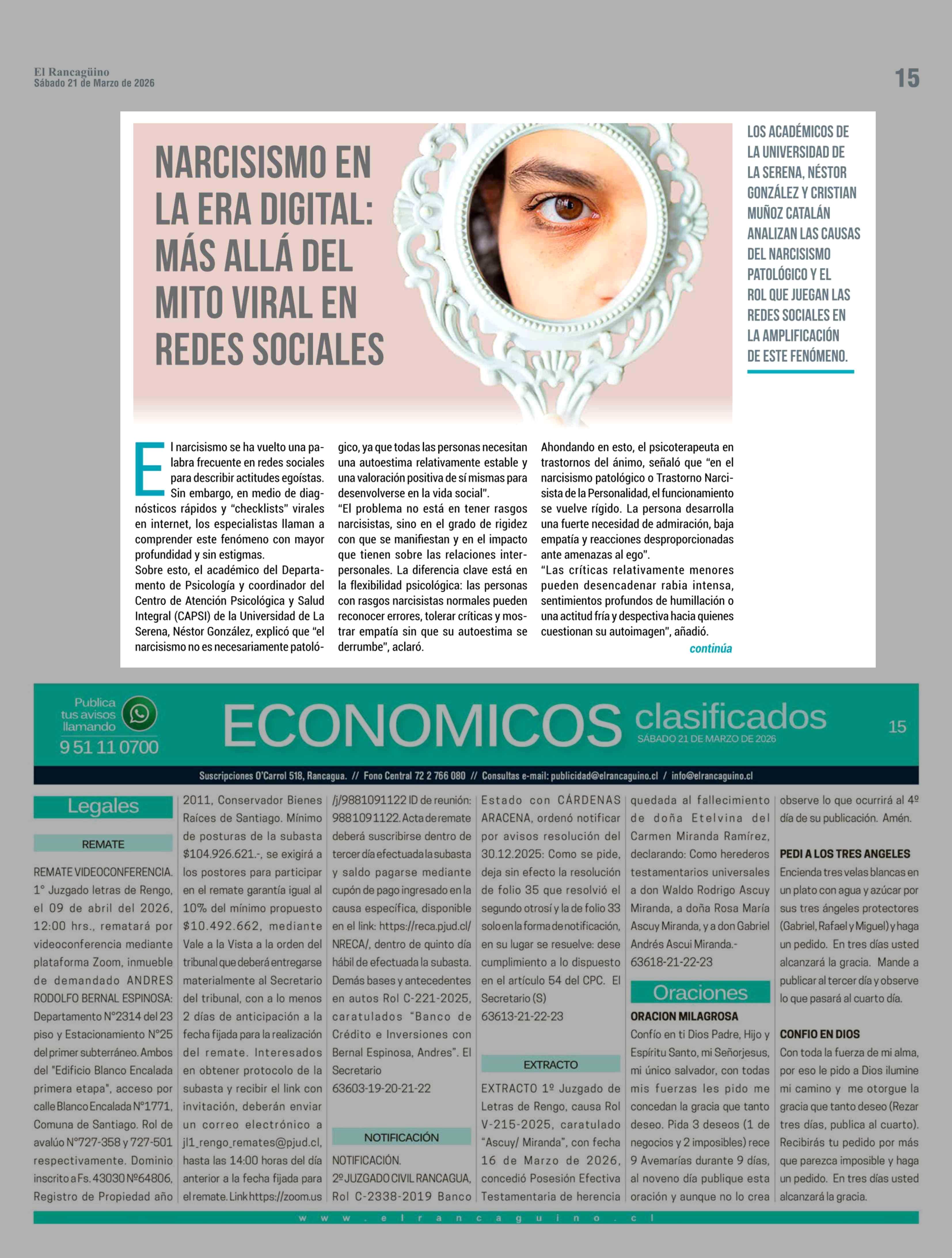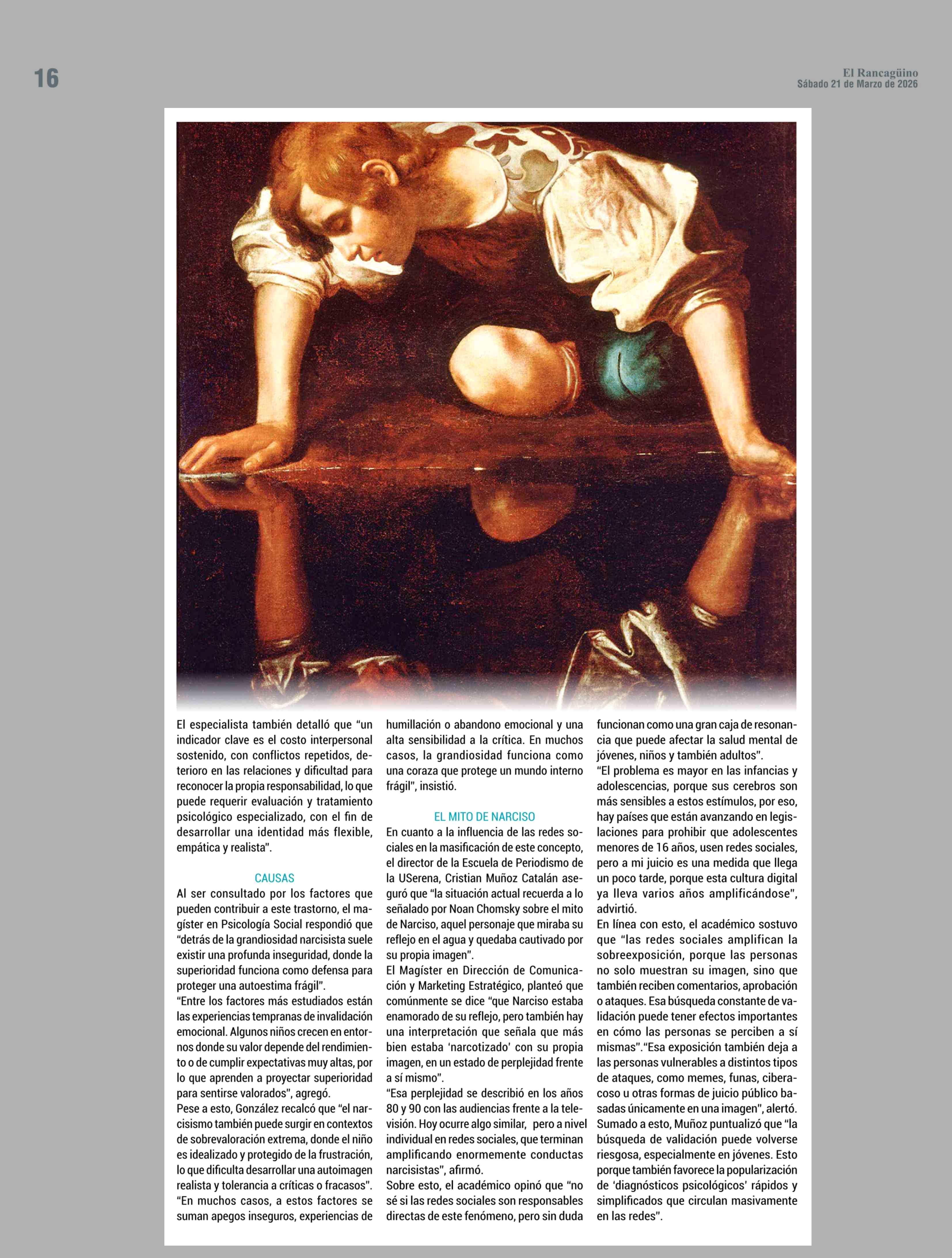 NARCISISMO EN LA ERA DIGITAL: MÁS ALLÁ DEL MITO VIRAL EN REDES SOCIALES 21-03-2026 El Rancagüino |