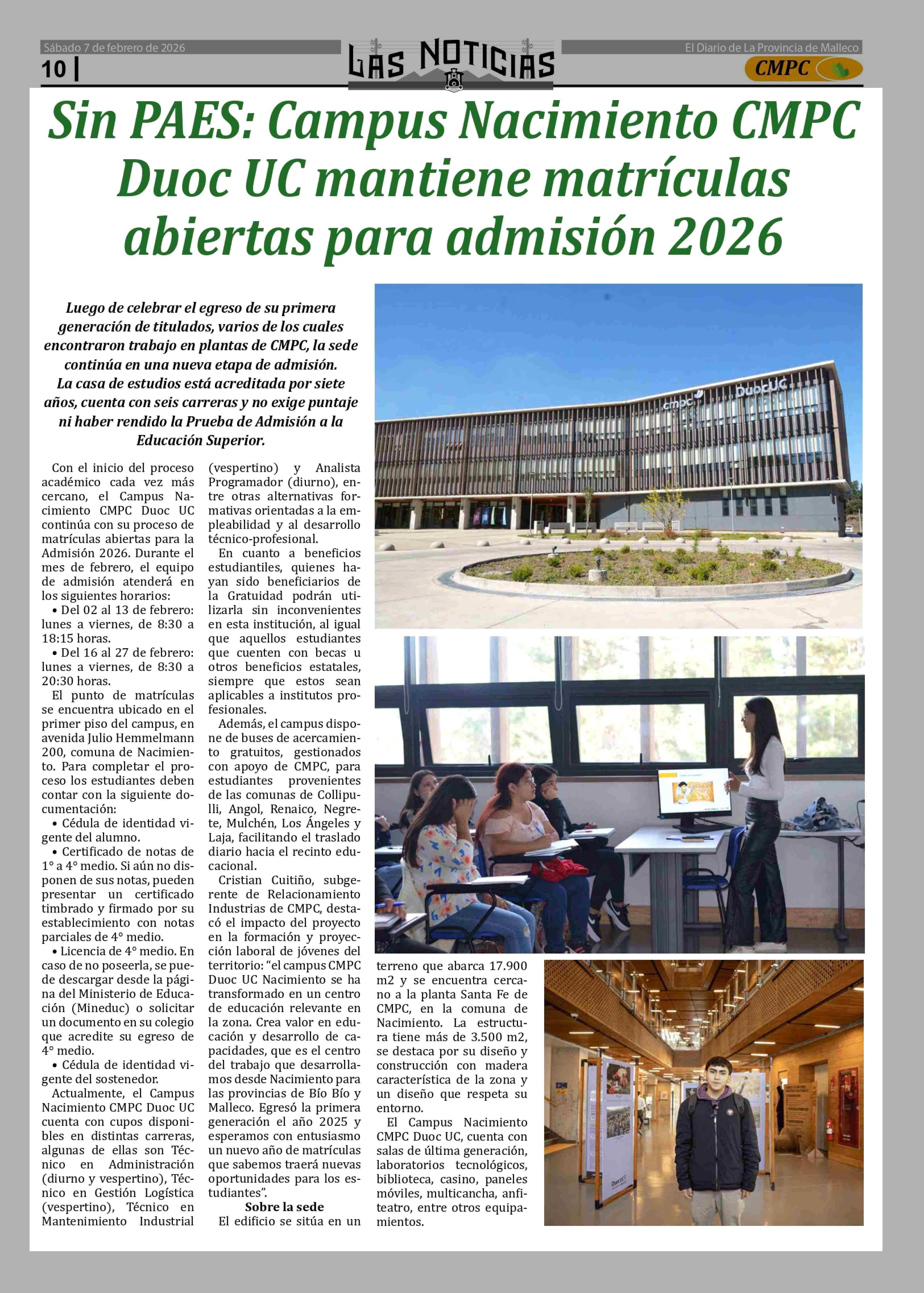 Sin PAES: Campus Nacimiento CMPC Duoc UC mantiene matrículas abiertas para admisión 2026 07-02-2026 Las Noticias |