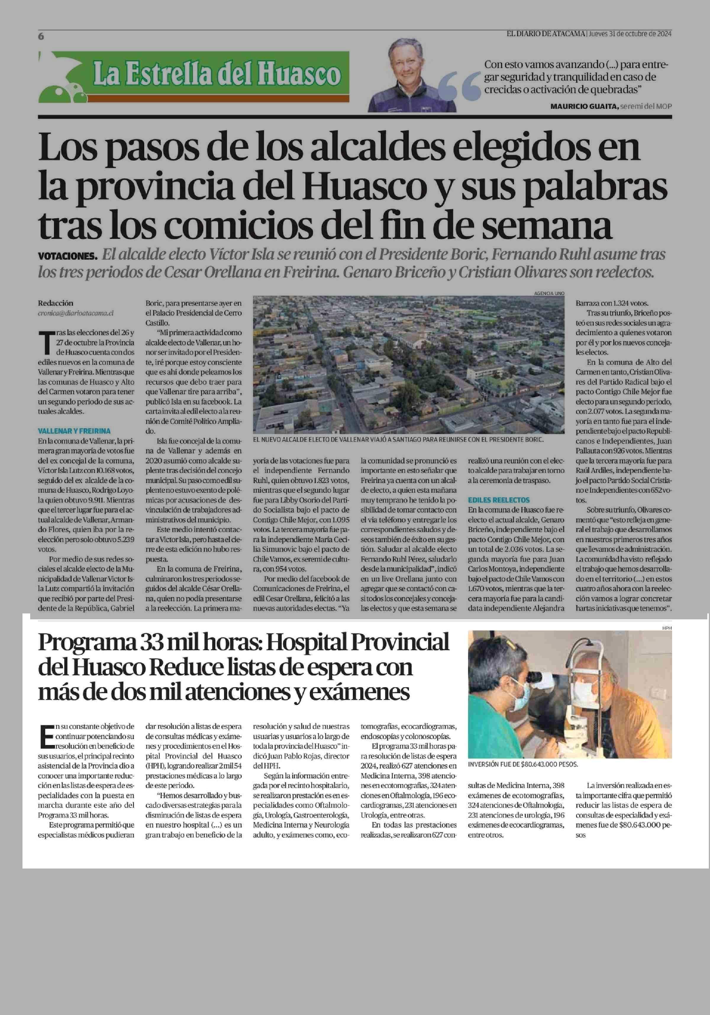 33 mil horas: Hospital Provincial del Huasco Reduce listas de espera con más de dos mil atenciones y exámenes 31-10-2024 El Diario de Atacama |