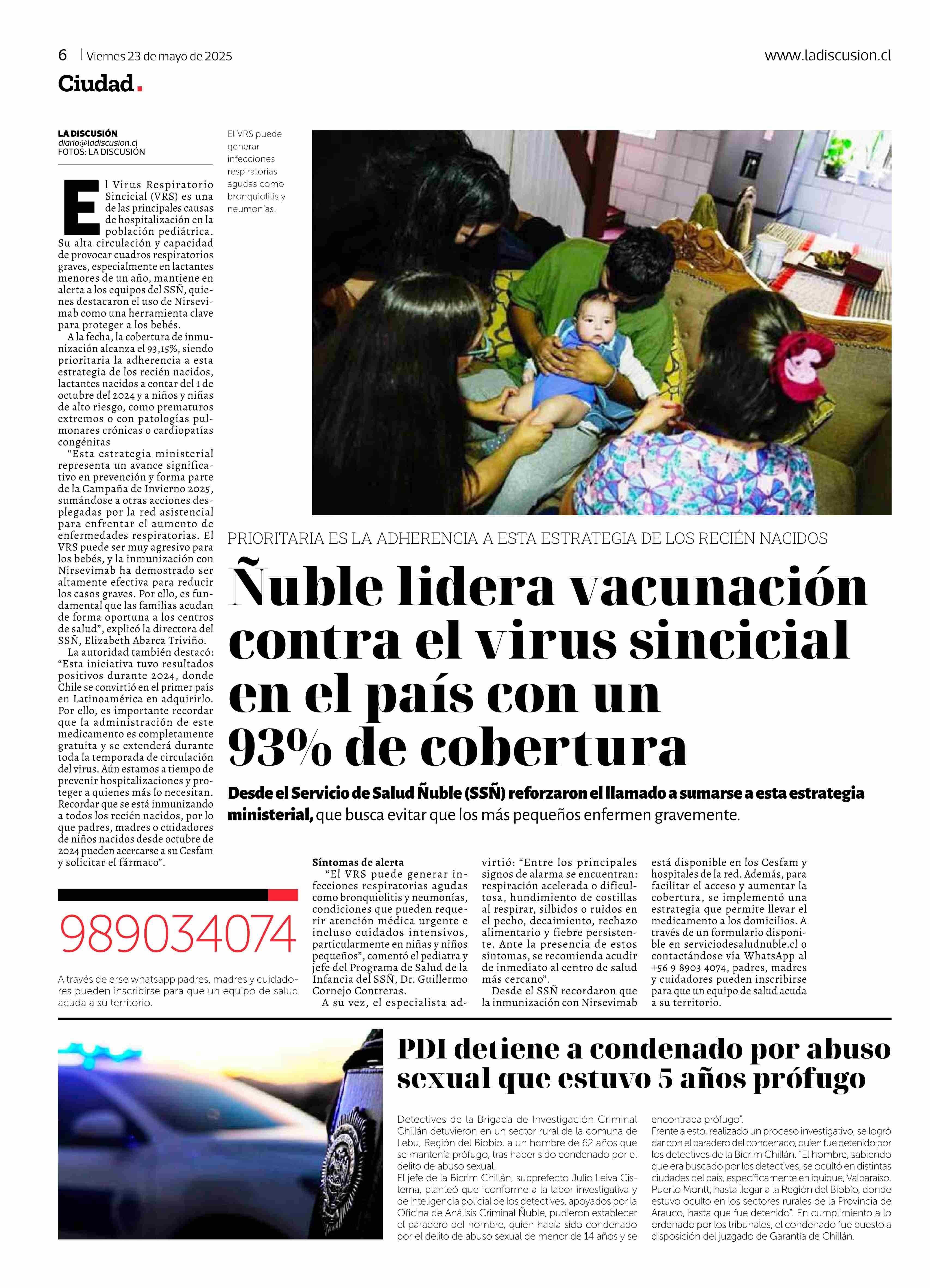 Ñuble lidera vacunación contra el virus sincicial en el país con un 93% de cobertura 23-05-2025 La Discusión |