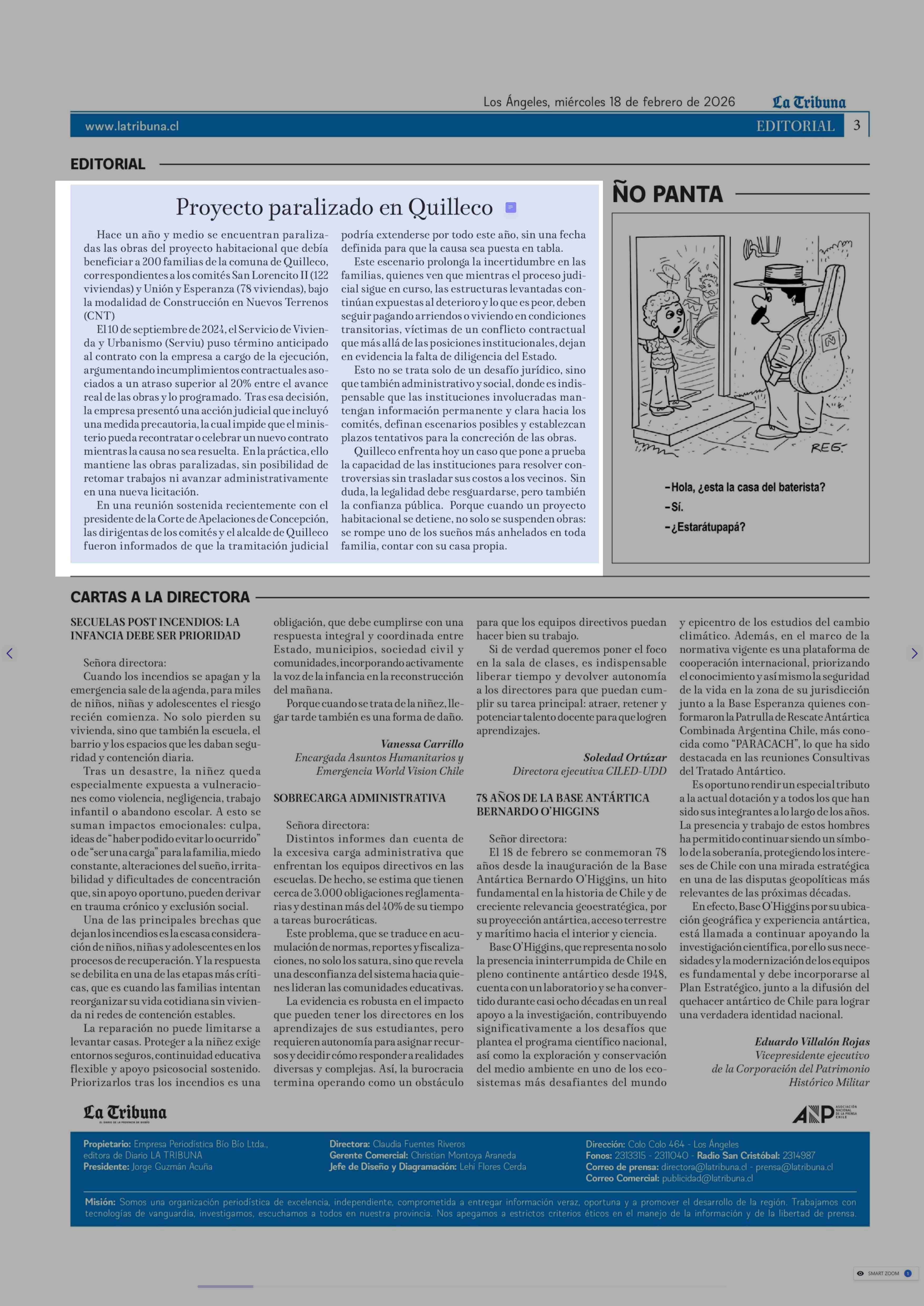 EDITORIAL: Proyecto paralizado en Quilleco 18-02-2026 La Tribuna |