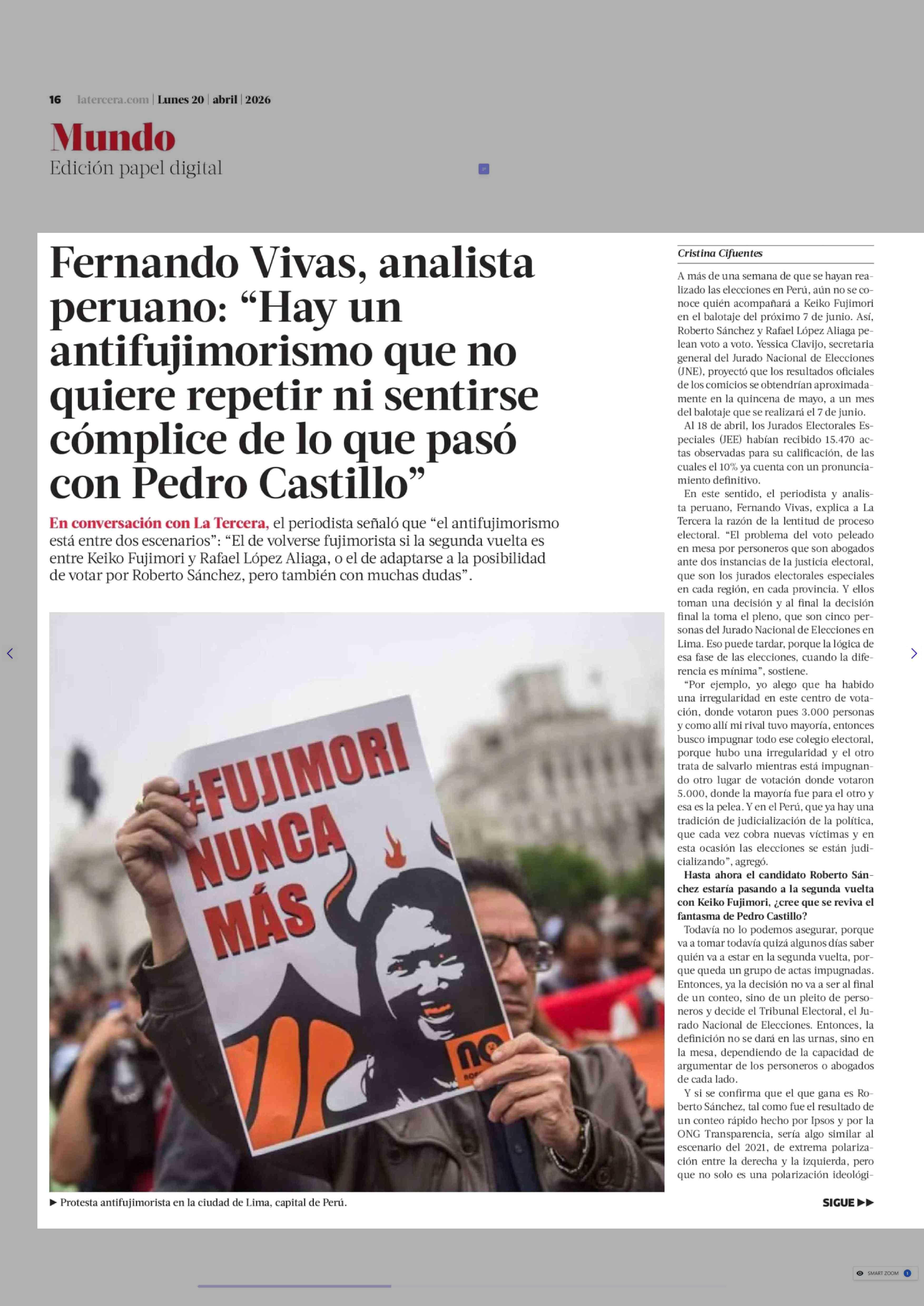 Fernando Vivas, analista peruano: "Hay un antifujimorismo que no quiere repetir ni sentirse cómplice de lo que pasó con Pedro Castillo" 20-04-2026 La Tercera |