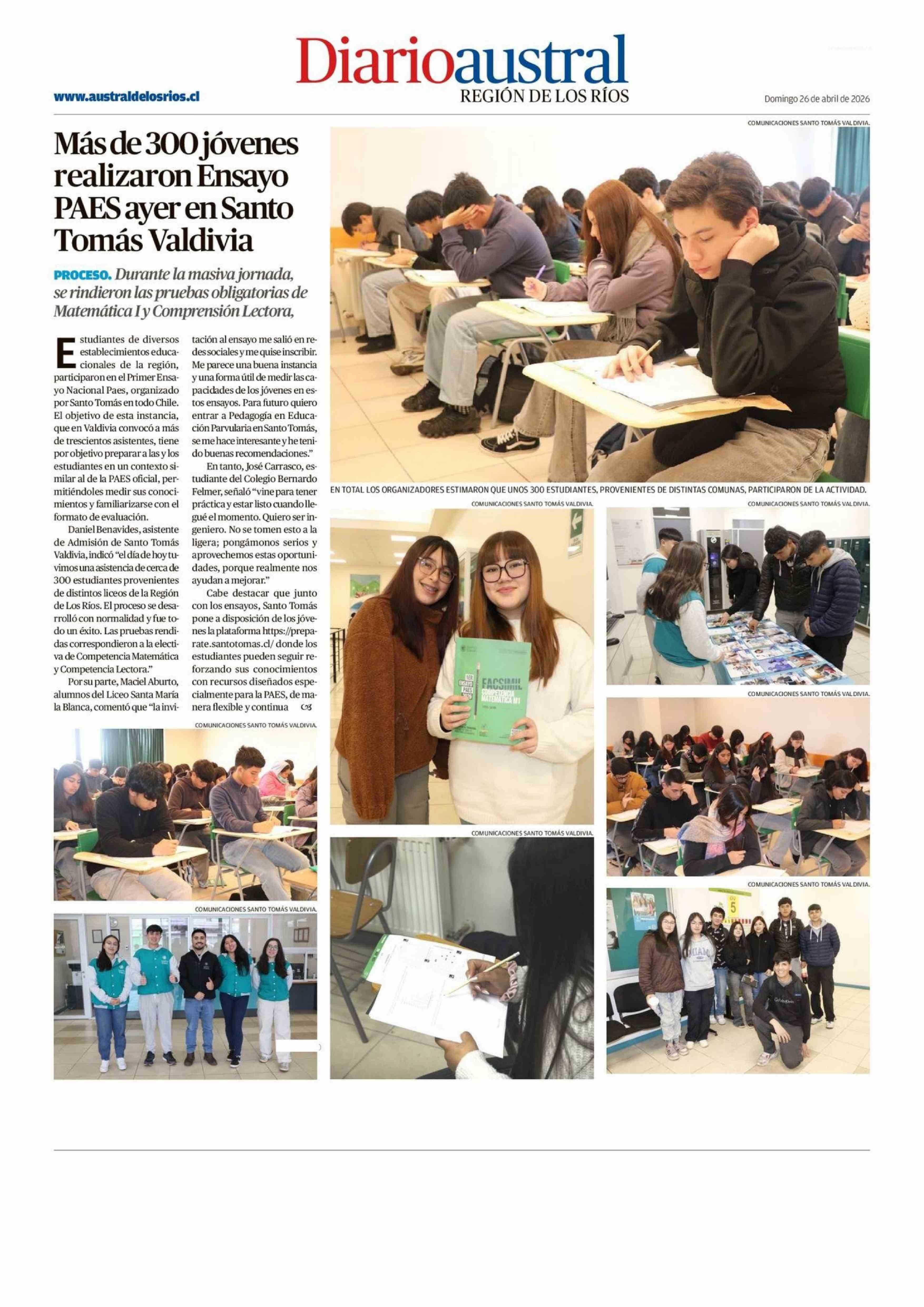 Más de 300 jóvenes realizaron Ensayo PAES ayer en Santo Tomás Valdivia 26-04-2026 Diario Austral Región de Los Ríos |