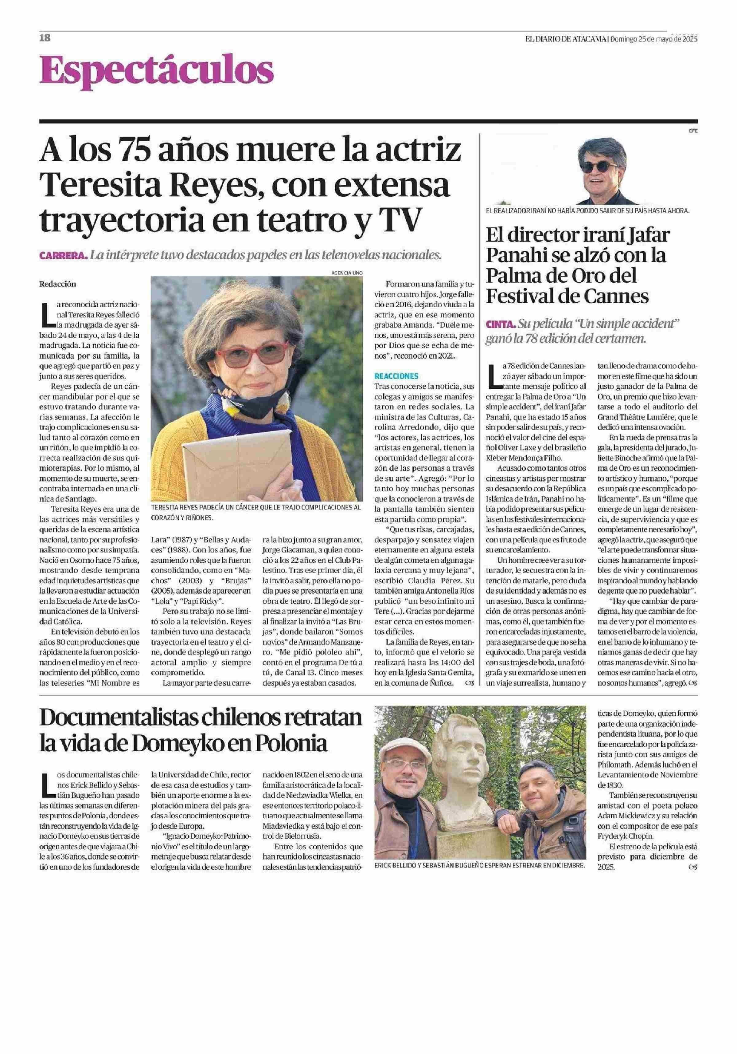 Alos 75 años muere la actriz Teresita Reyes, con extensa trayectoria en teatro y TV 25-05-2025 El Diario de Atacama |