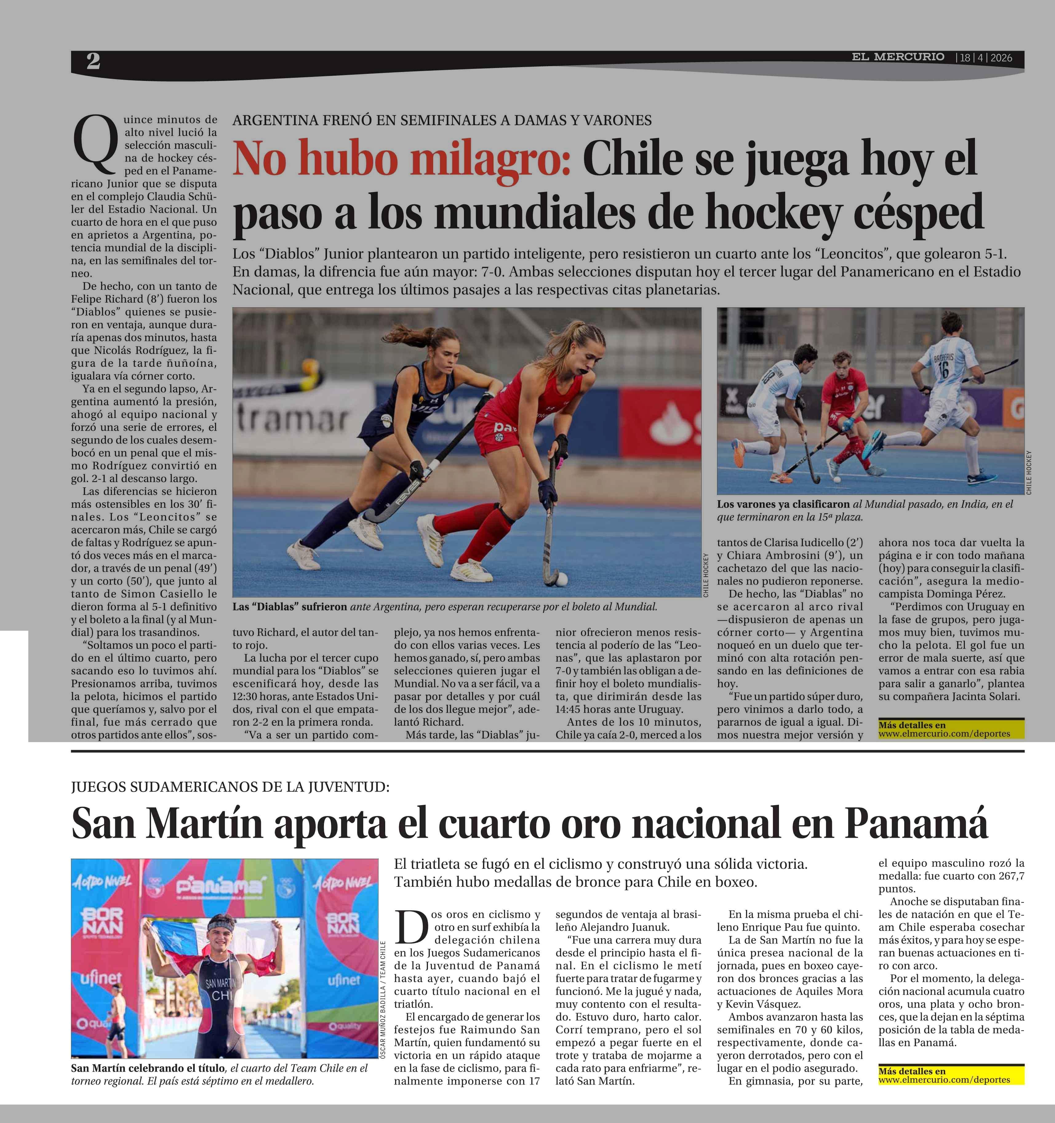 San Martín aporta el cuarto oro nacional en Panamá 18-04-2026 El Mercurio |