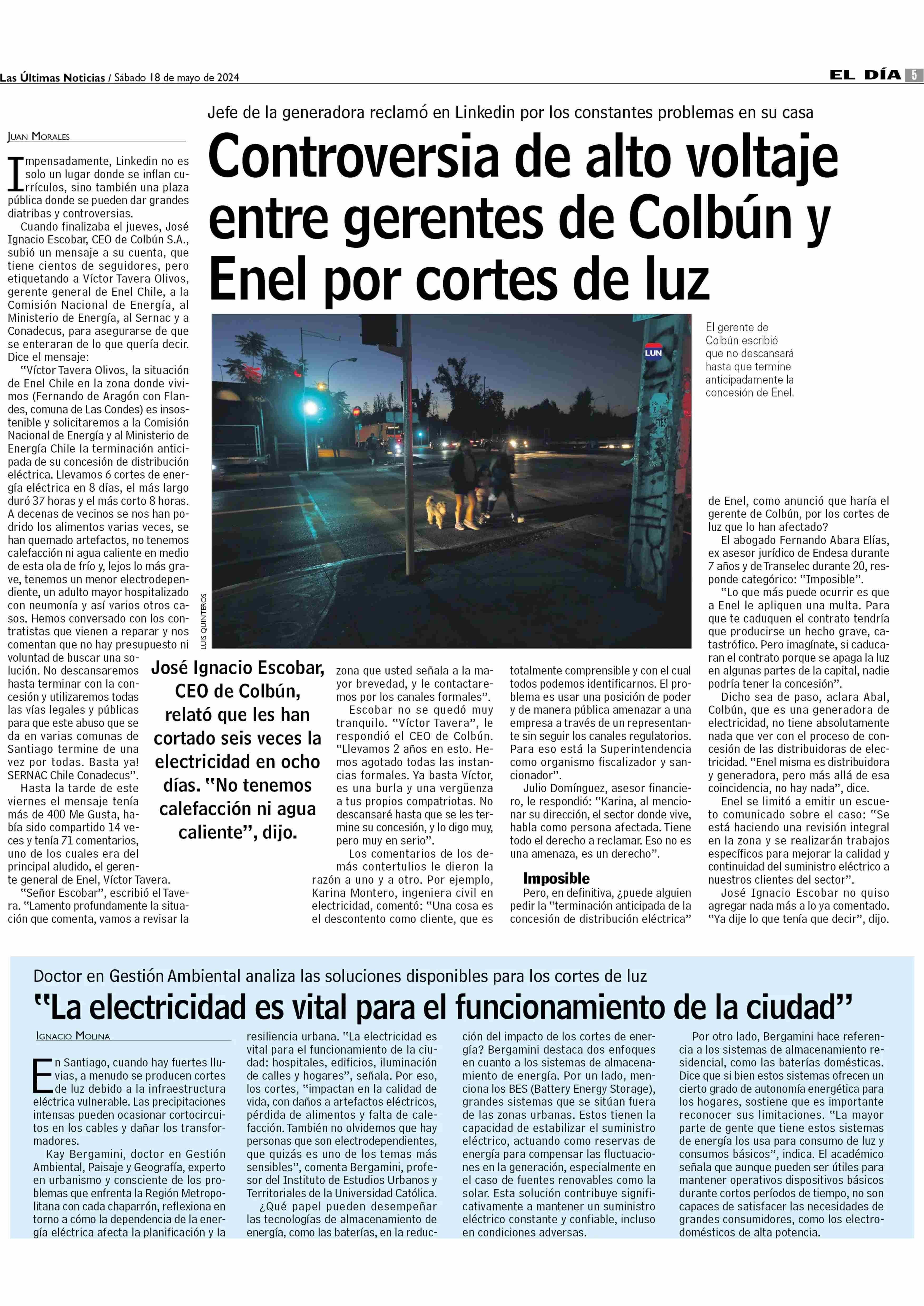 “La electricidad es vital para el funcionamiento de la ciudad” 18-05-2024 Las Últimas Noticias |