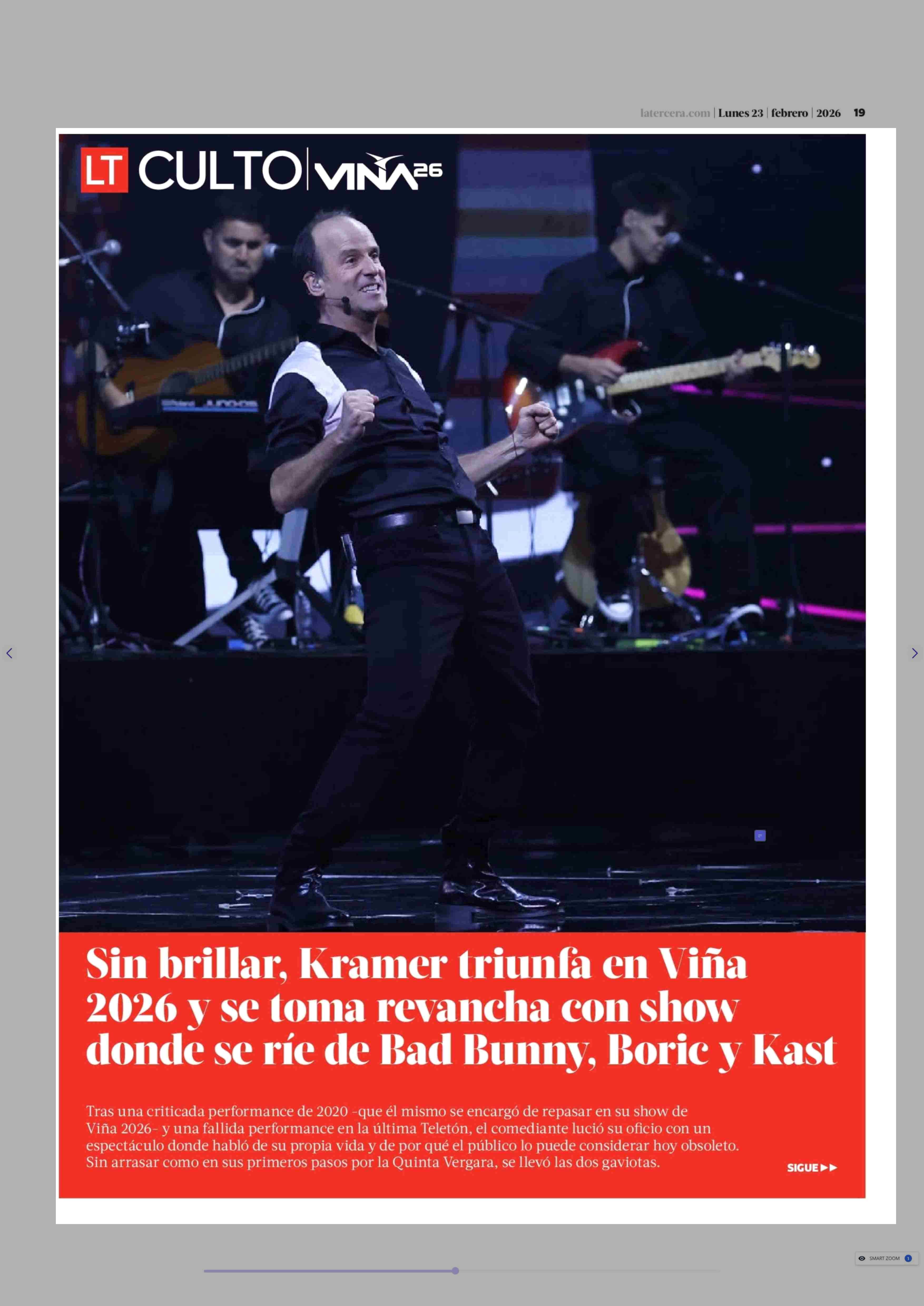 Título: Sin brillar, Kramer triunfa en Viña 2026 y se toma revancha con show donde se ríe de Bad Bunny, Boric y kast