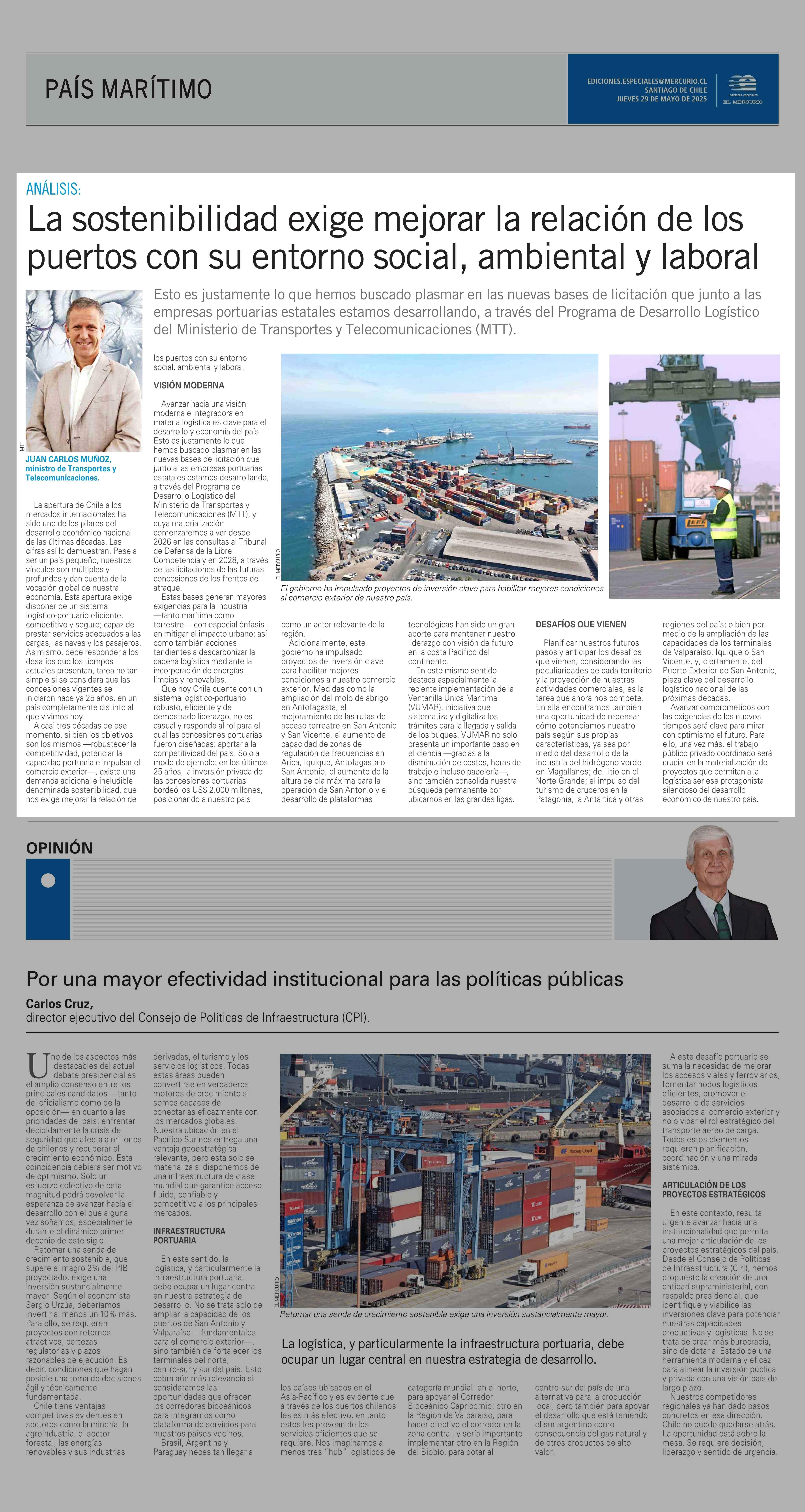 La sostenibilidad exige mejorar la relación de los puertos con su entorno social, ambiental y laboral 29-05-2025 El Mercurio |