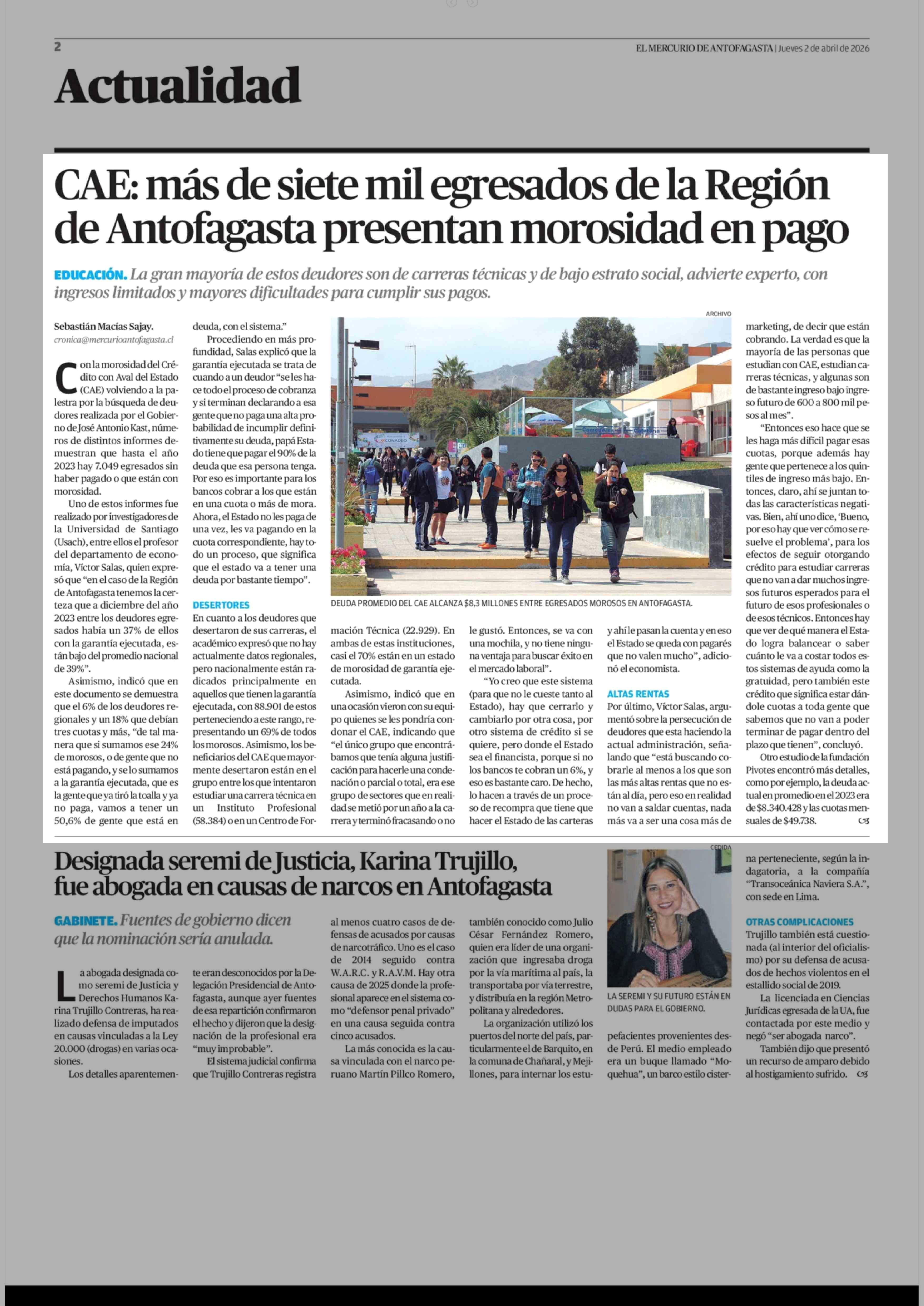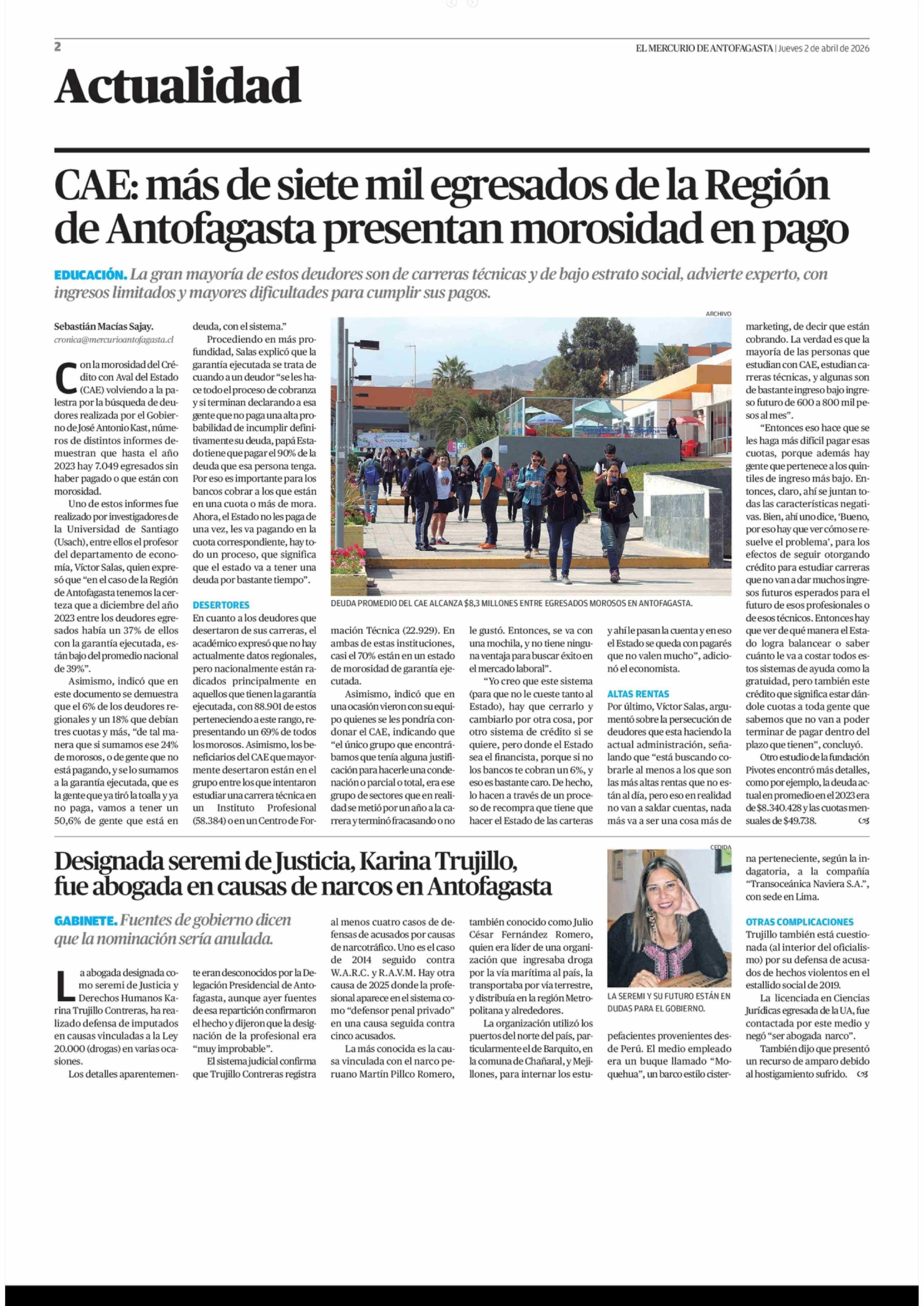 CAE: más de siete mil egresados de la Región de Antofagasta presentan morosidad en pago 02-04-2026 El Mercurio de Antofagasta |