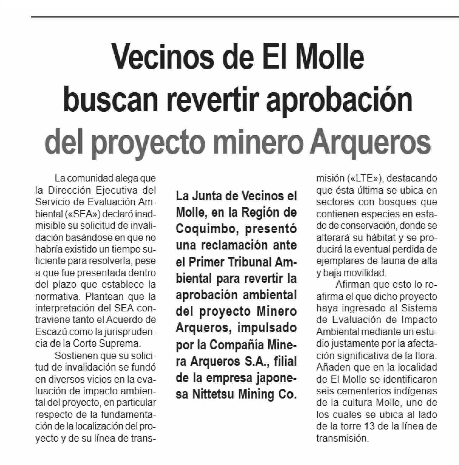 Título: Vecinos de El Molle buscan revertir aprobación del proyecto minero Arqueros