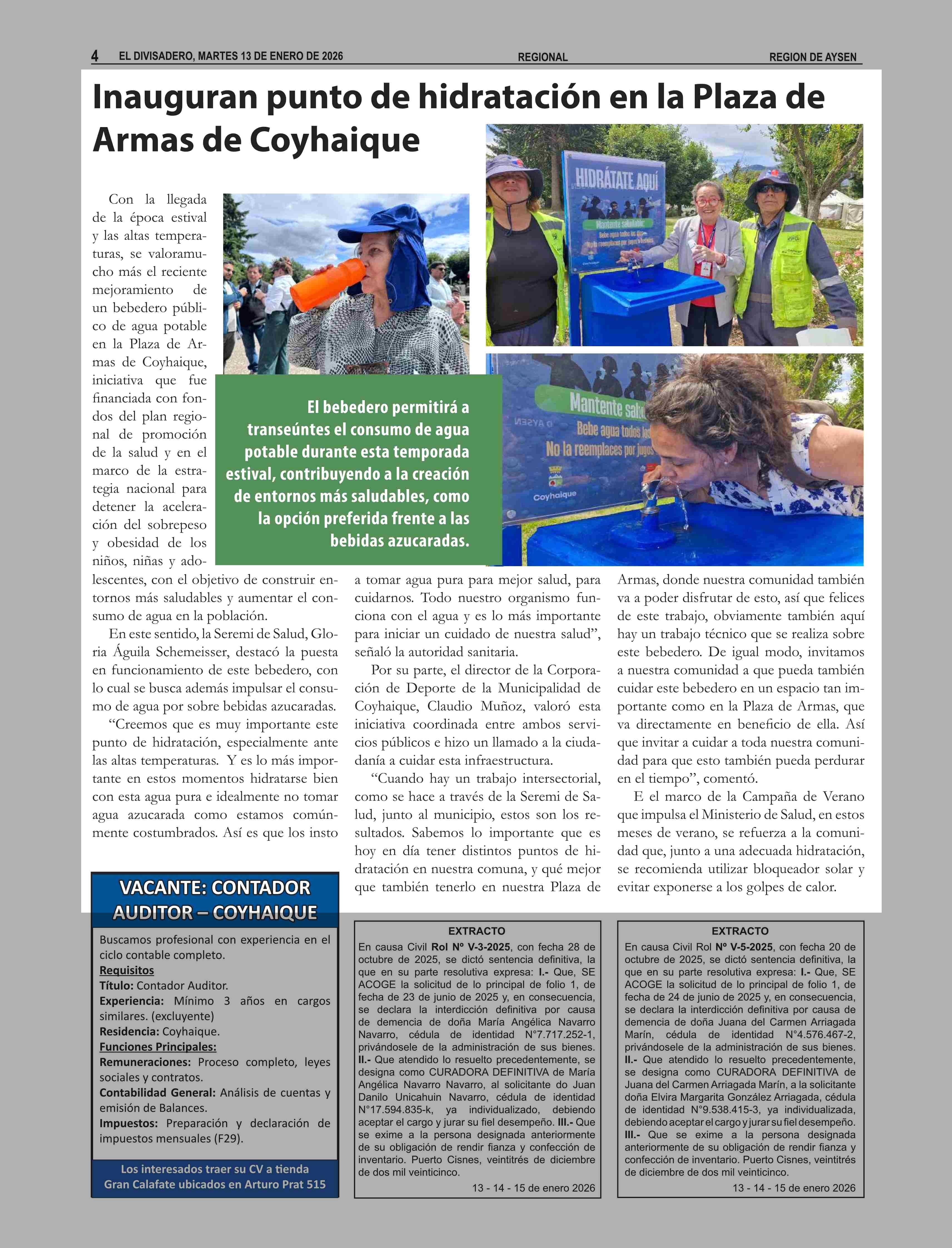 Inauguran punto de hidratación en la Plaza de Armas de Coyhaique 13-01-2026 El Divisadero |