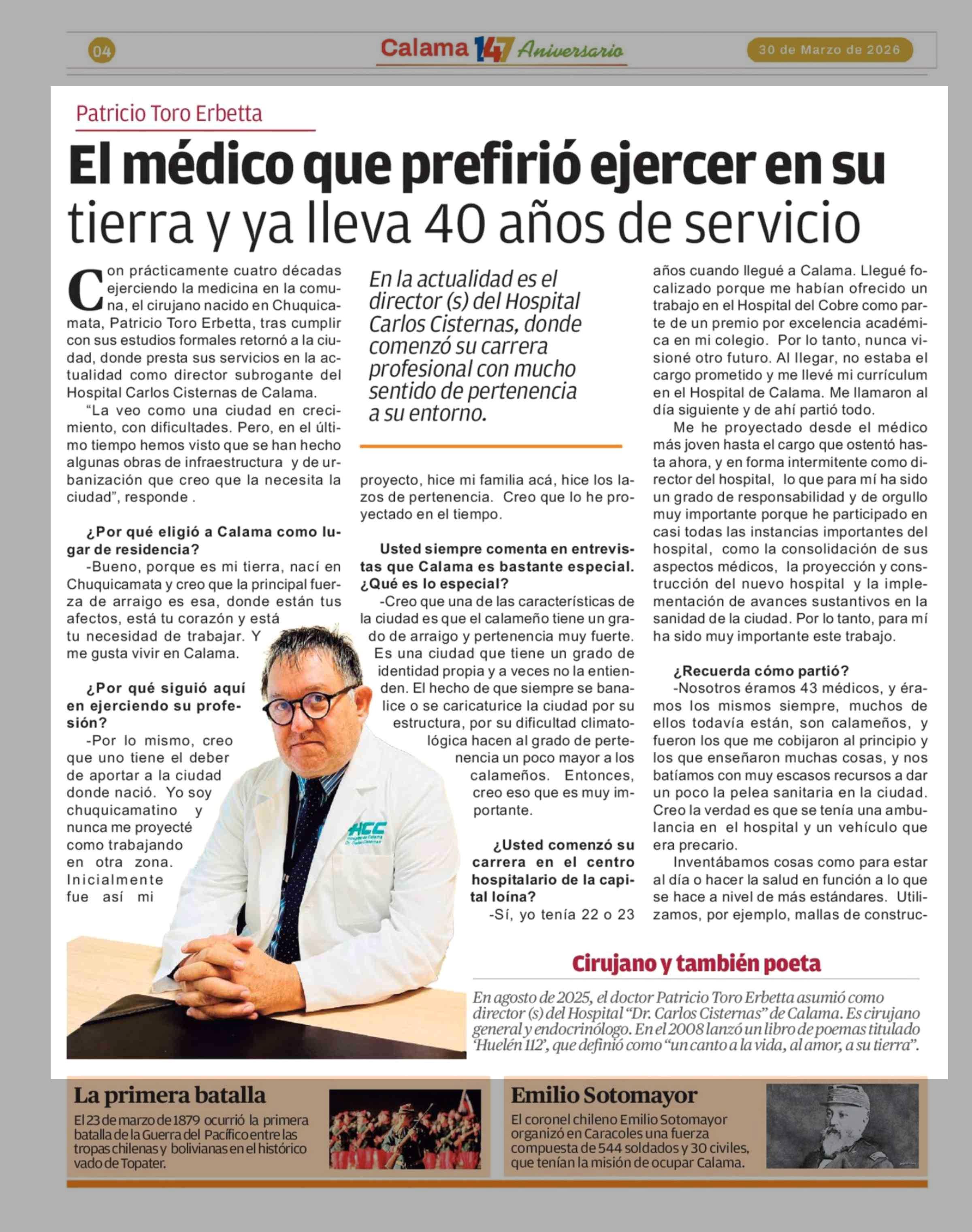 El médico que prefirió ejercer en su tierra y ya lleva 40 años de servicio 30-03-2026 El Mercurio de Calama |