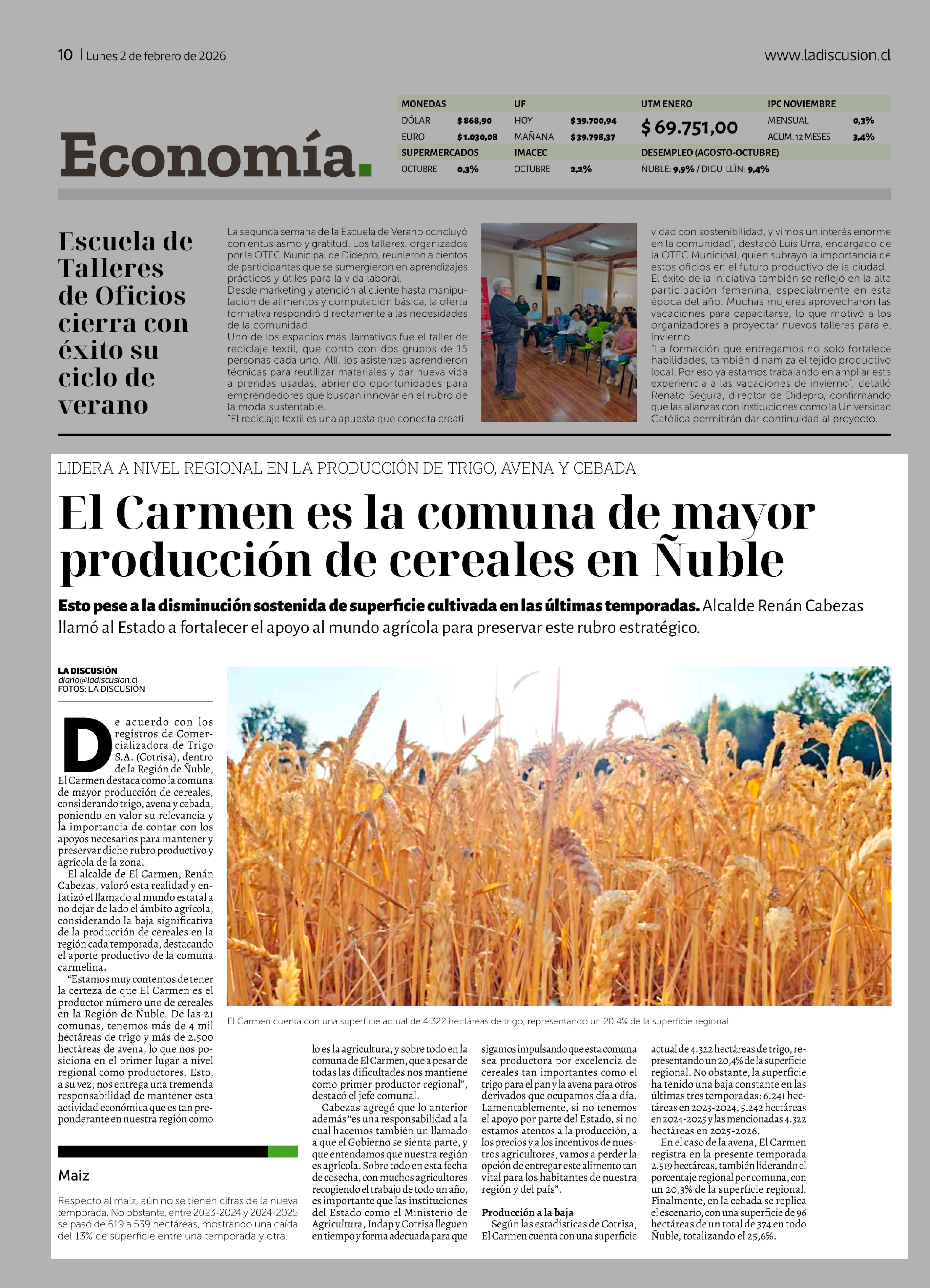 El Carmen es la comuna de mayor producción de cereales en Ñuble 02-02-2026 La Discusión |