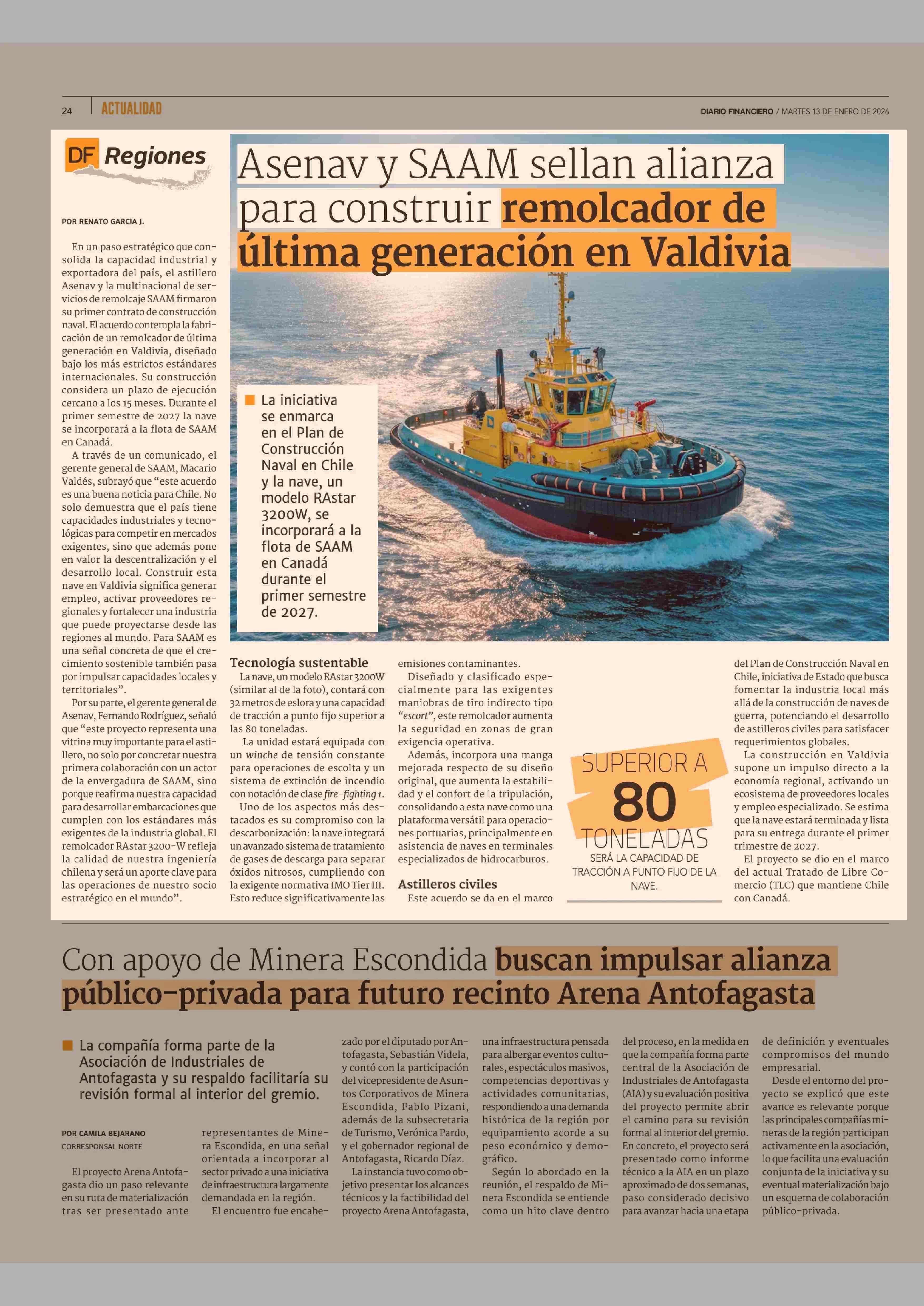 Asenav y SAAM sellan alianza para construir remolcador de última generación en Valdivia 13-01-2026 Diario Financiero |