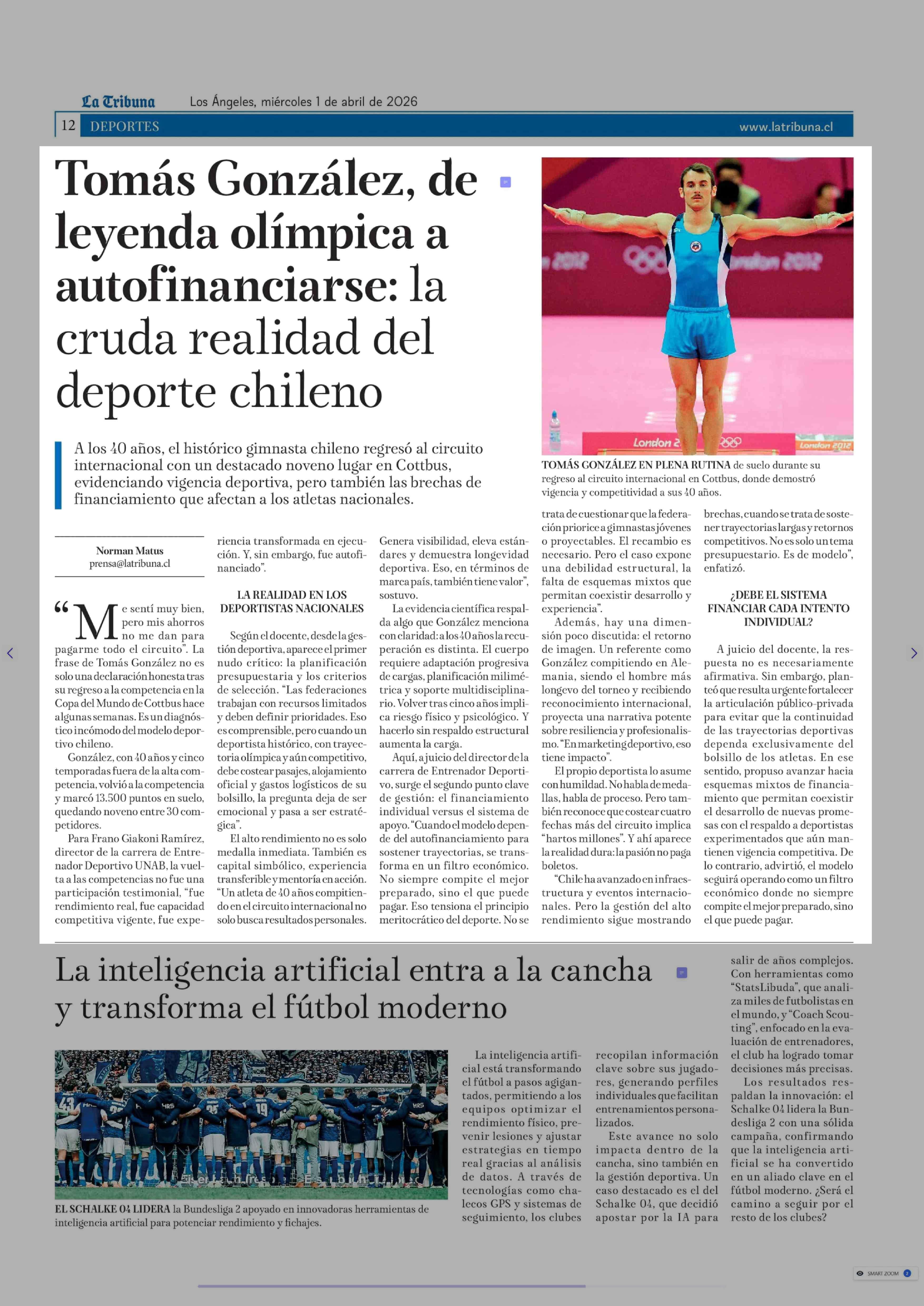 Tomás González, de leyenda olímpica a autofinanciarse: la cruda realidad del deporte chileno 01-04-2026 La Tribuna |