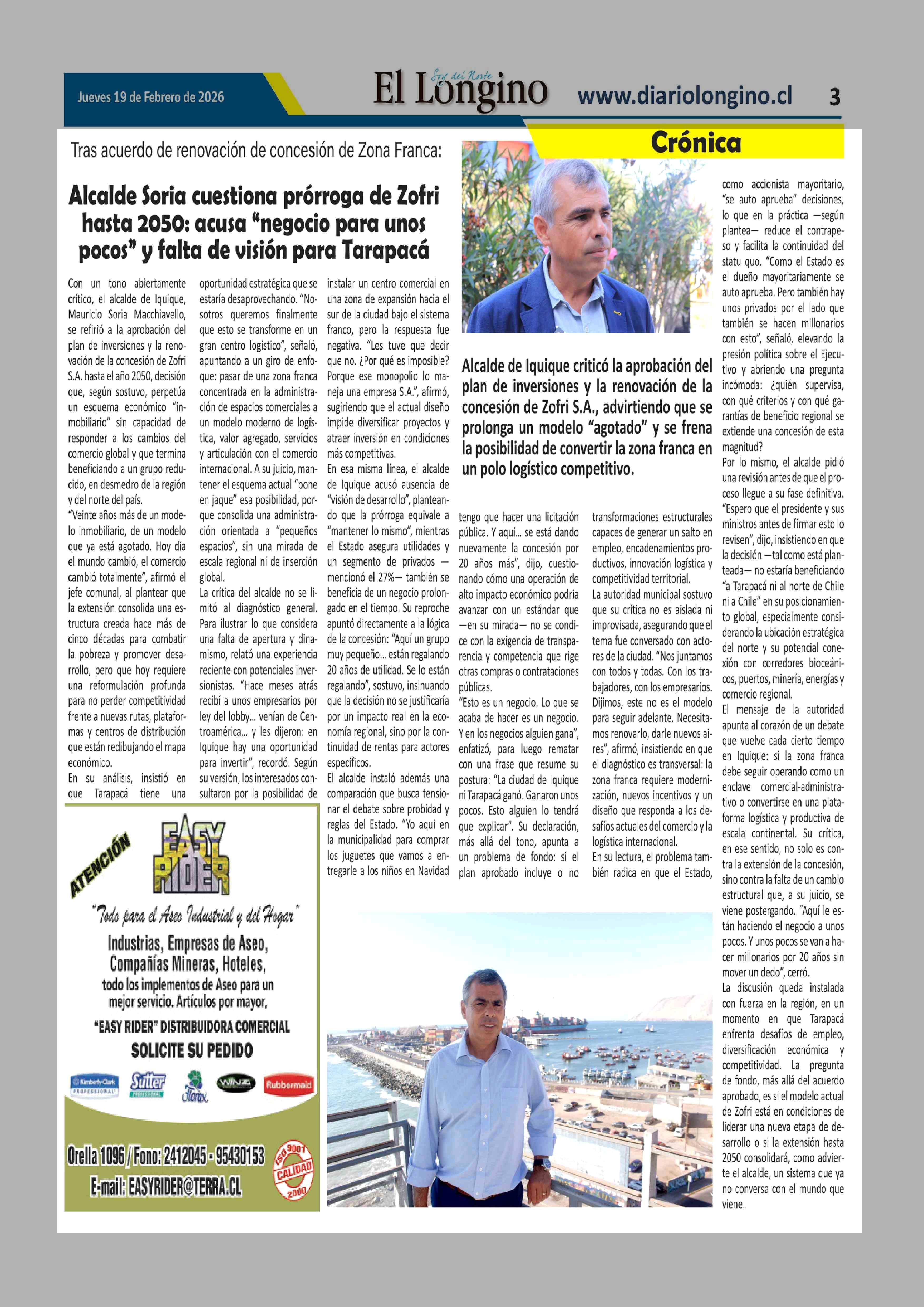 Alcalde Soria cuestiona prórroga de Zofri hasta 2050: acusa "negocio para unos pocos" y falta de visión para Tarapacá 19-02-2026 El Longino |
