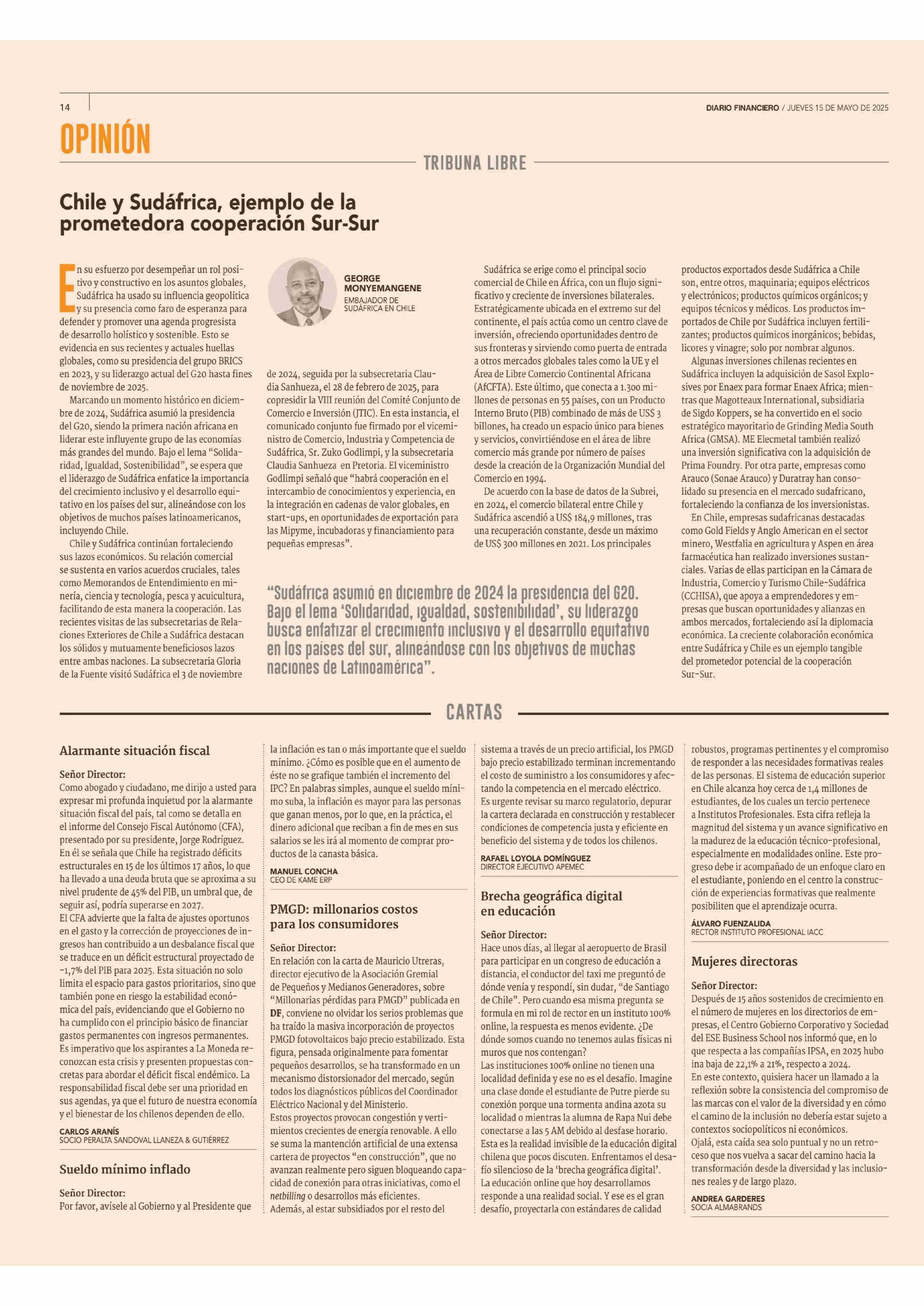 COLUMNAS DE OPINIÓN: Chile y Sudáfrica, ejemplo de la prometedora cooperación Sur-Sur 15-05-2025 Diario Financiero |