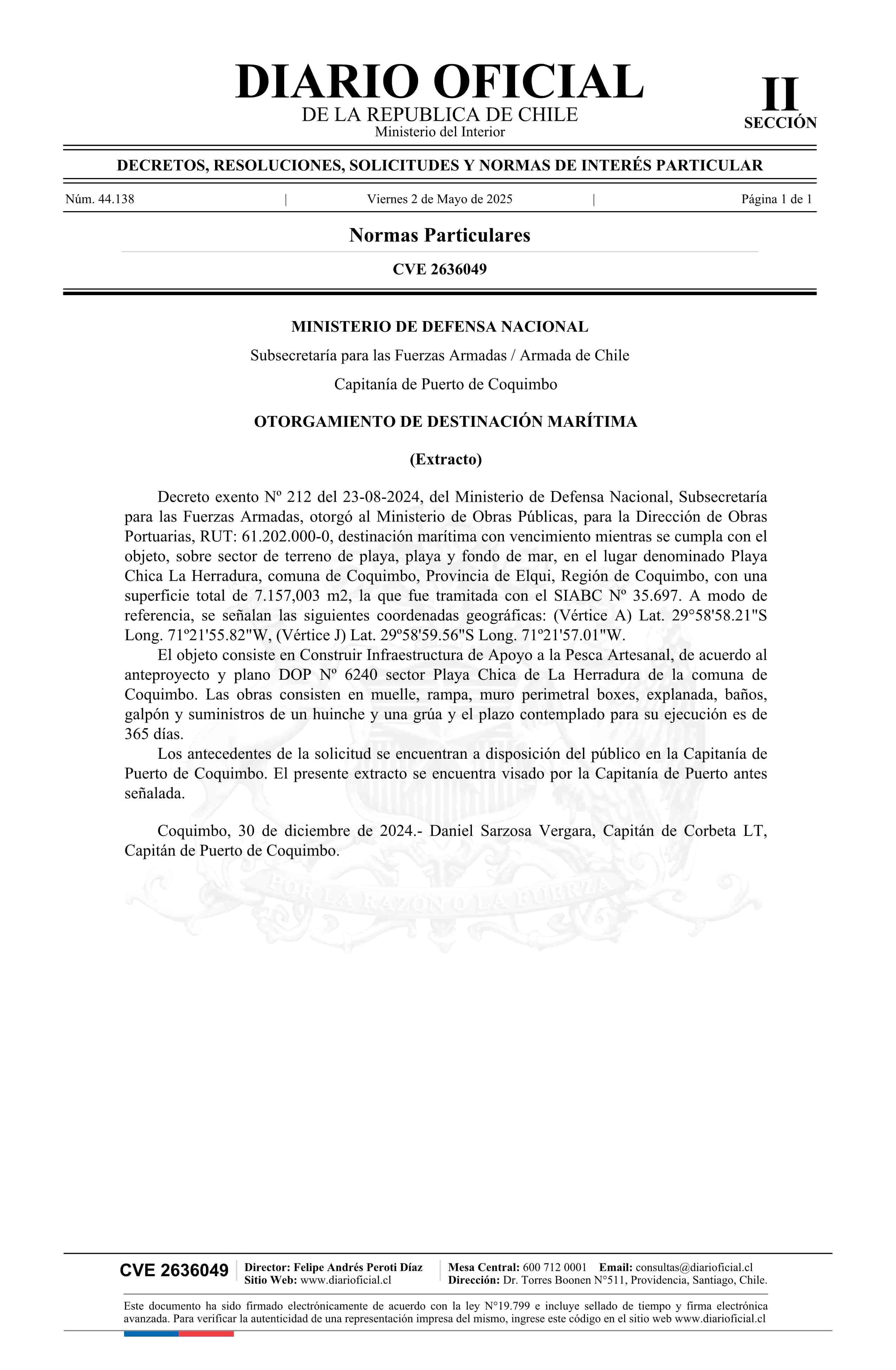 Extracto de decreto exento número 212, de 2024.- Otorga destinación marítima 02-05-2025 Diario Oficial Edición Electrónica |