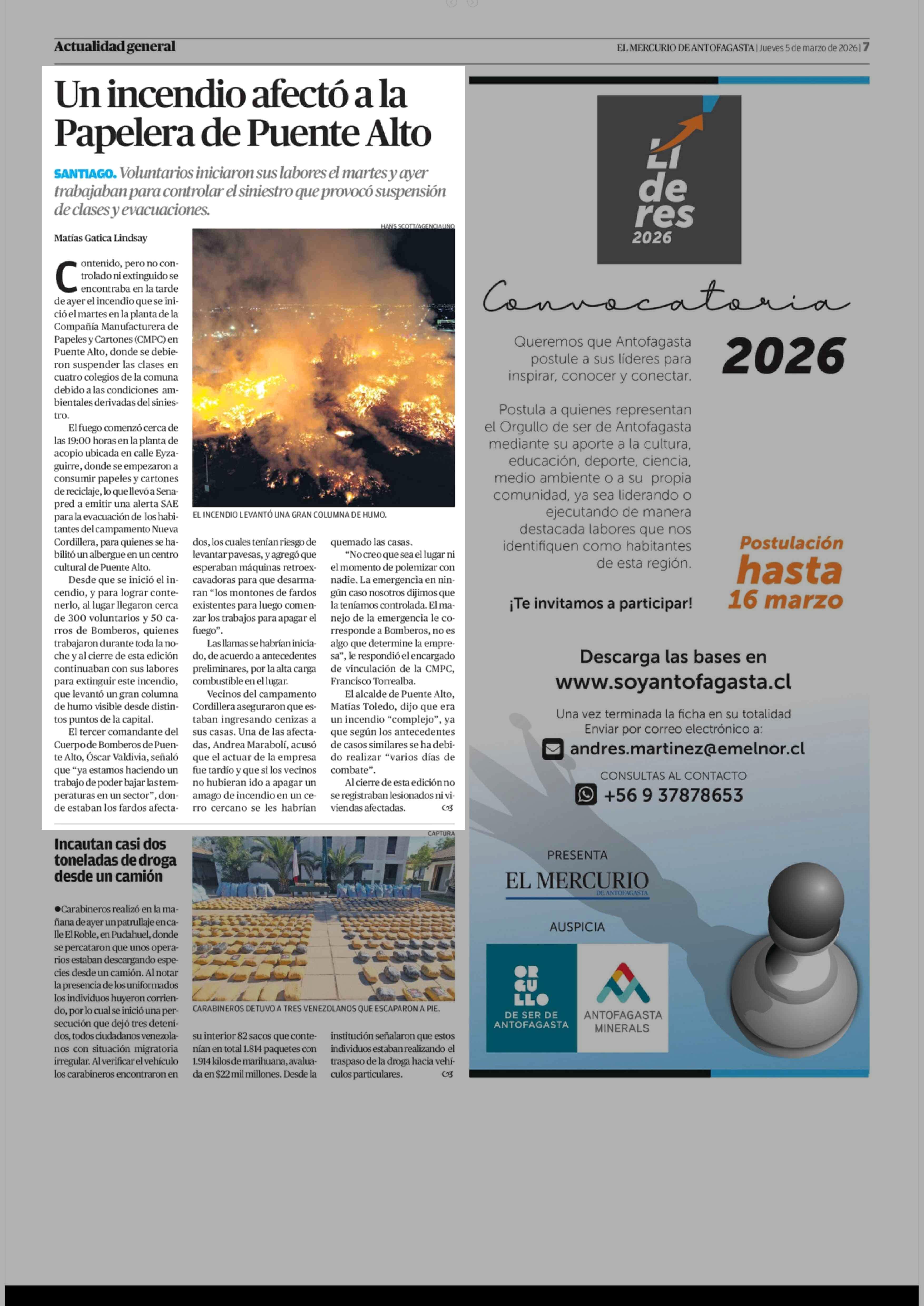 Un incendio afectó a la Papelera de Puente Alto 05-03-2026 El Mercurio de Antofagasta |
