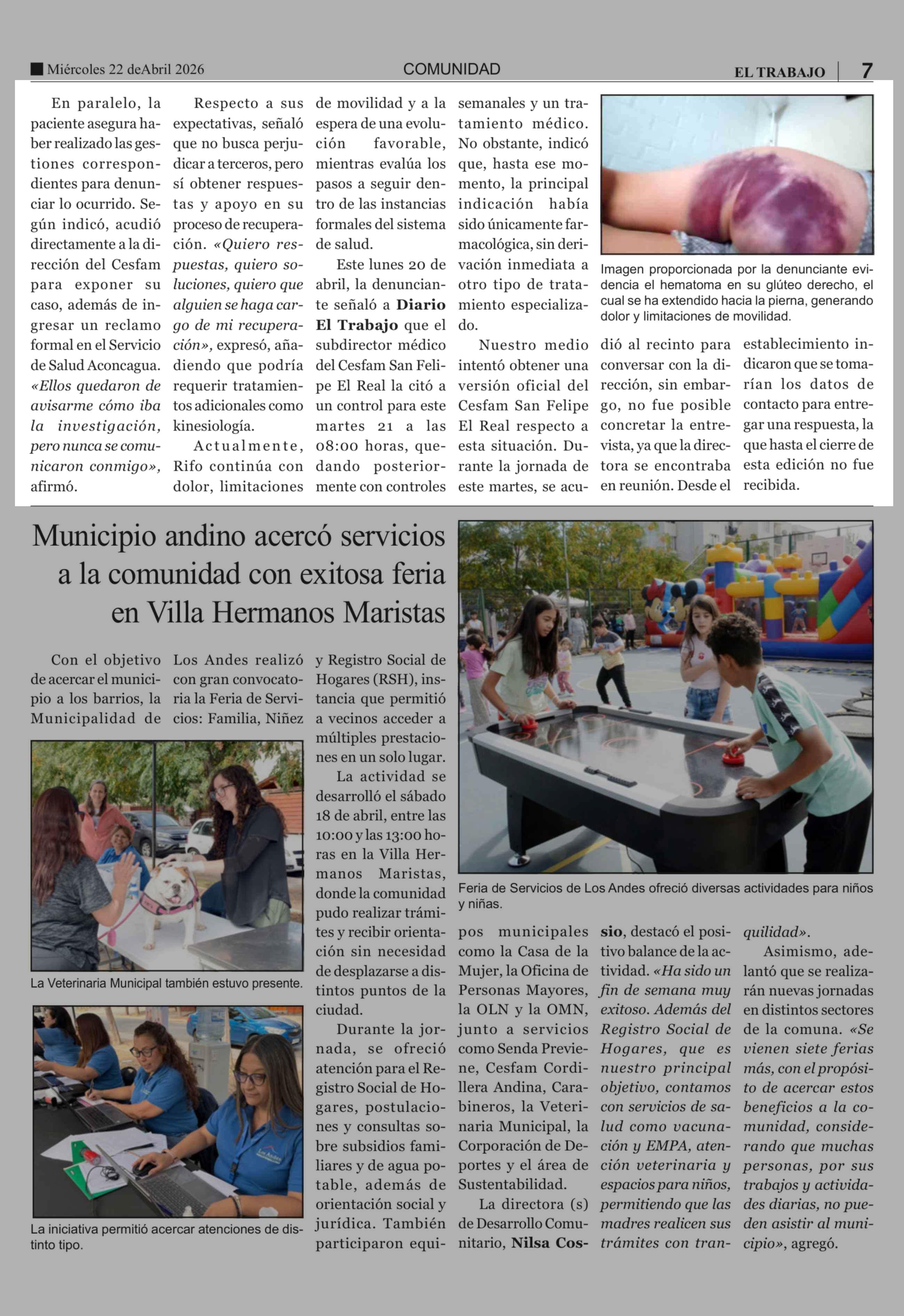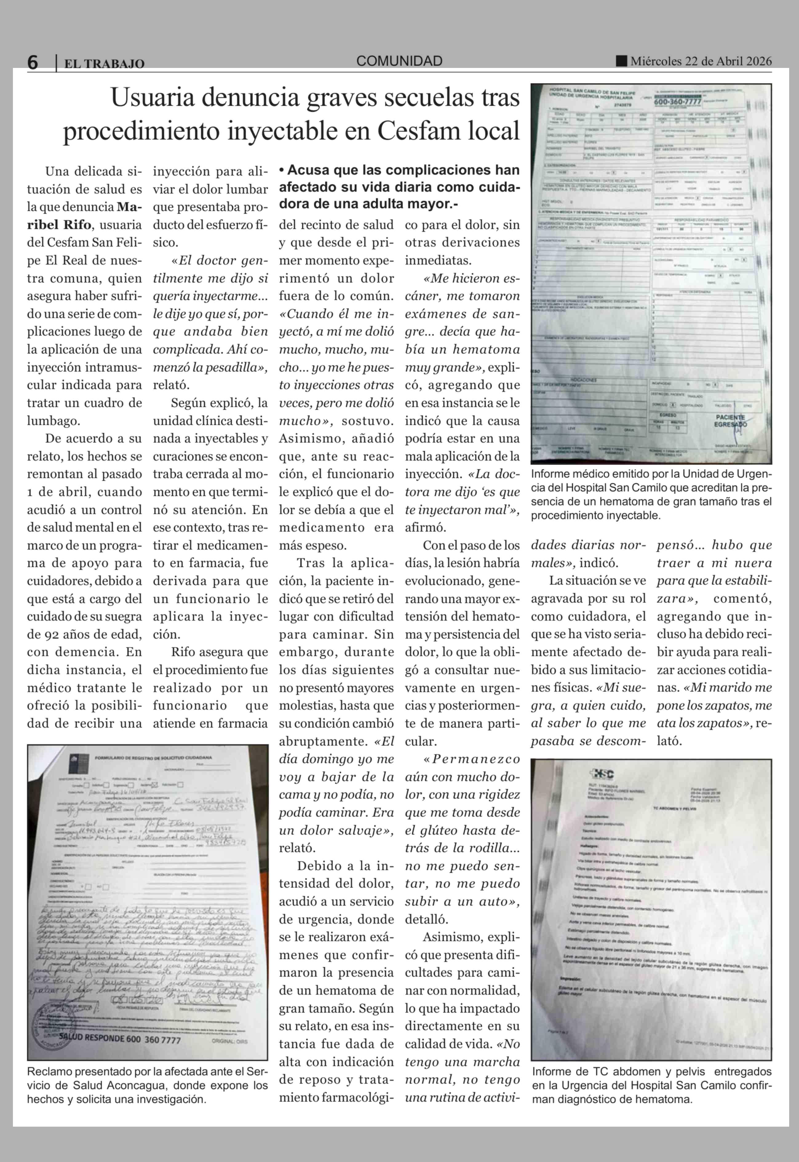 Usuaria denuncia graves secuelas tras procedimiento inyectable en Cesfam local 22-04-2026 El Trabajo |