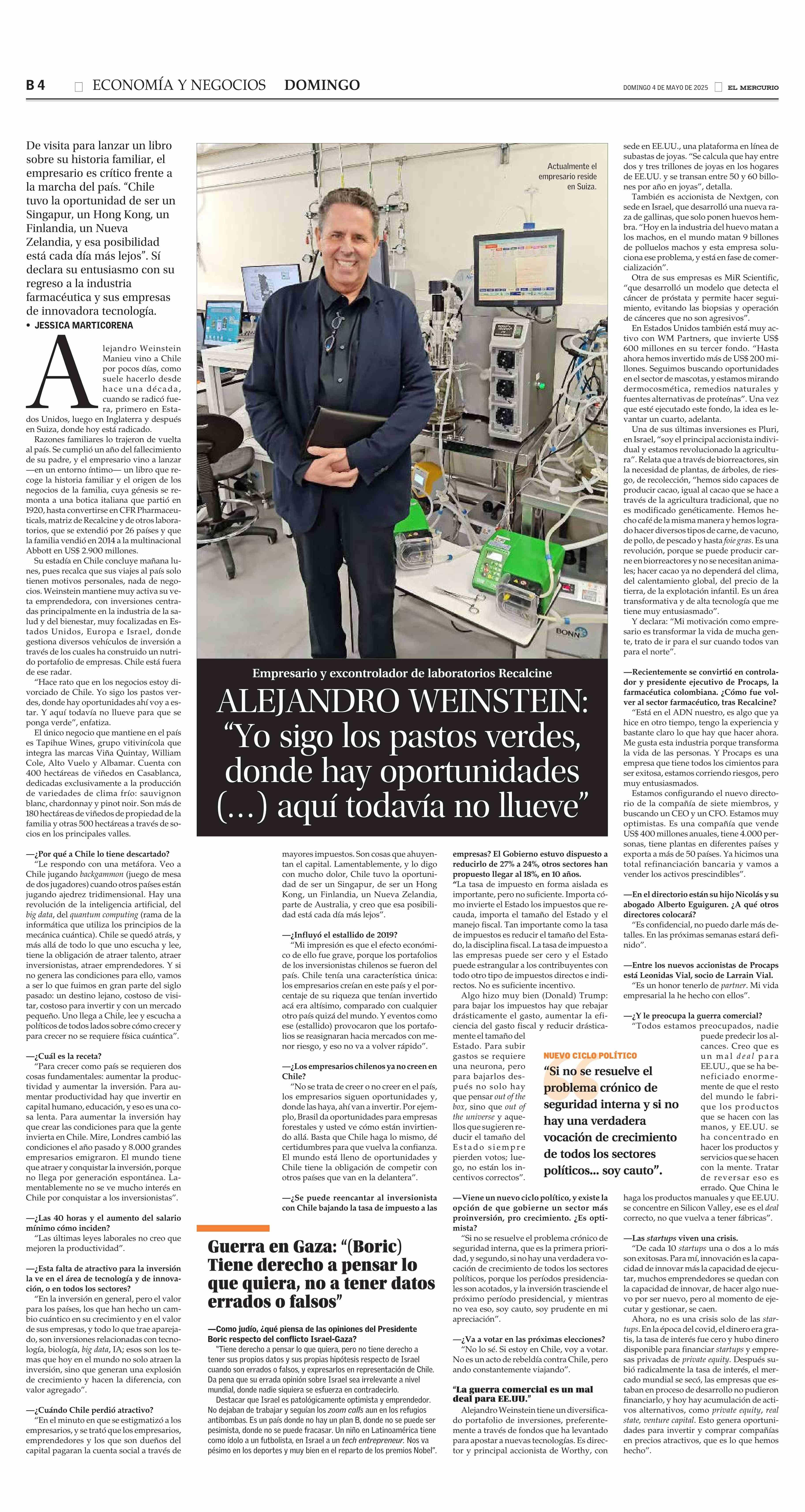 ALEJANDRO WEINSTEIN: “Yo sigo los pastos verdes, donde hay oportunidades (...) aquí todavía no llueve” 04-05-2025 El Mercurio |