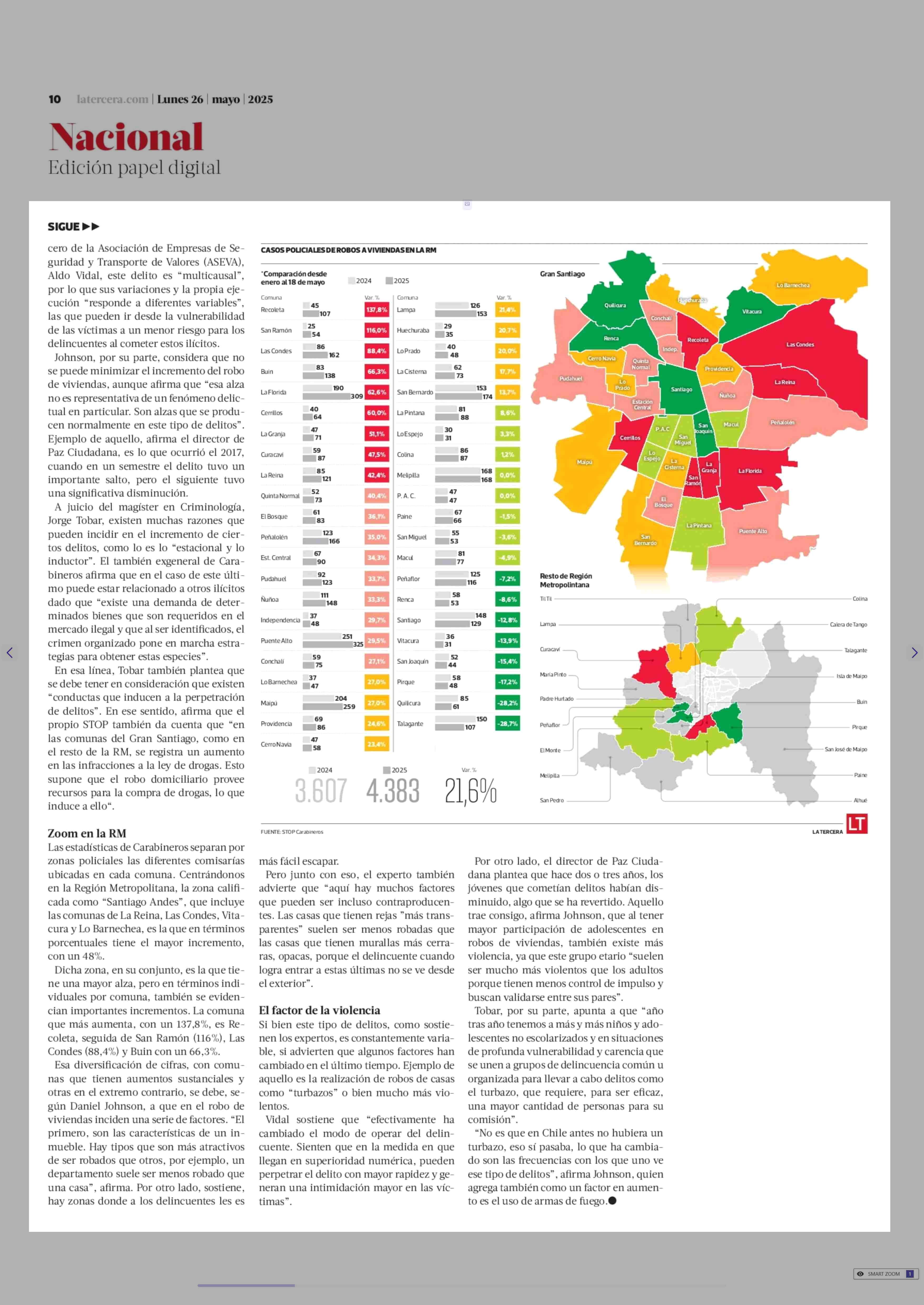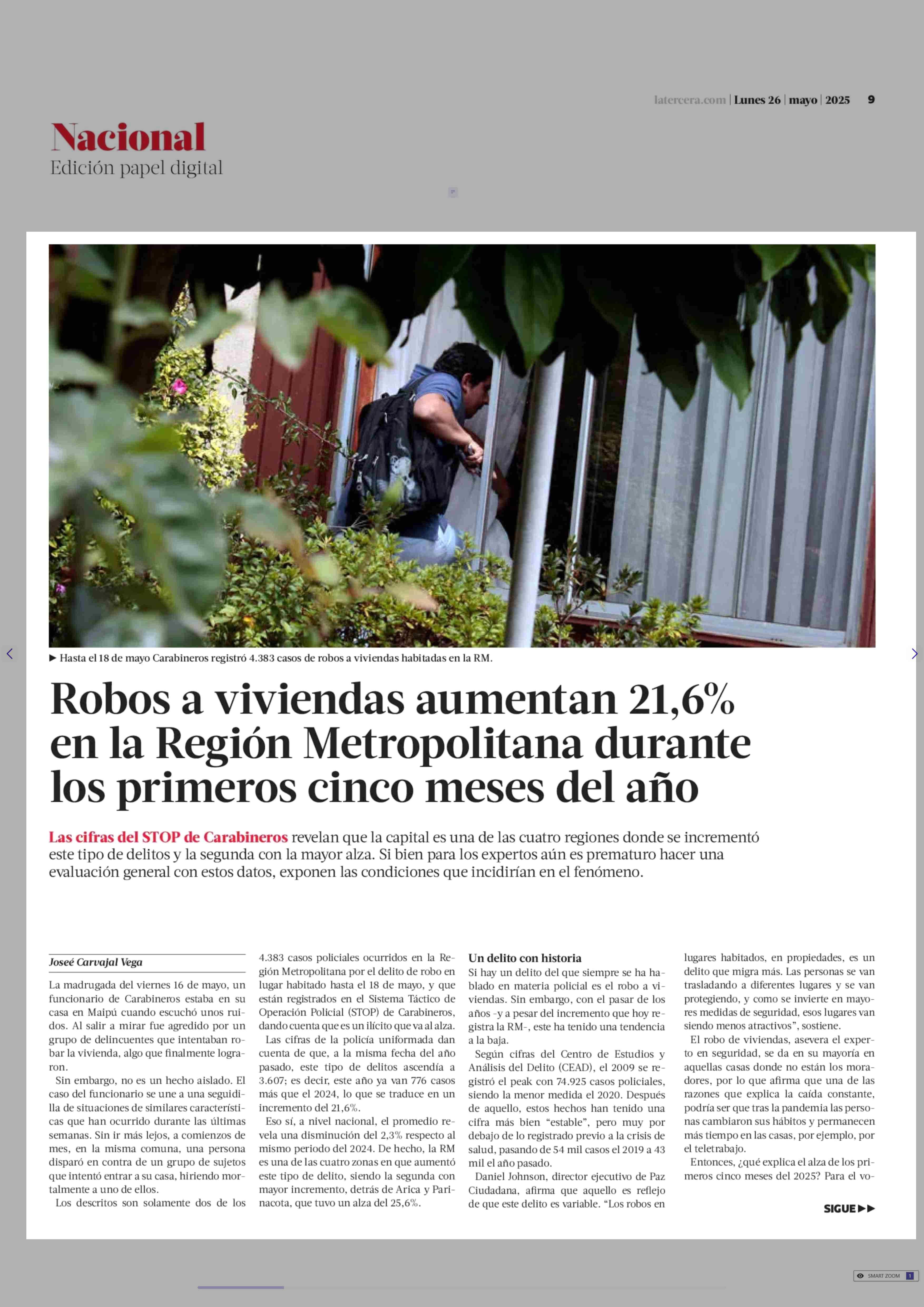Robos a viviendas aumentan 21,6% en la Región Metropolitana durante los primeros cinco meses del año 26-05-2025 La Tercera |