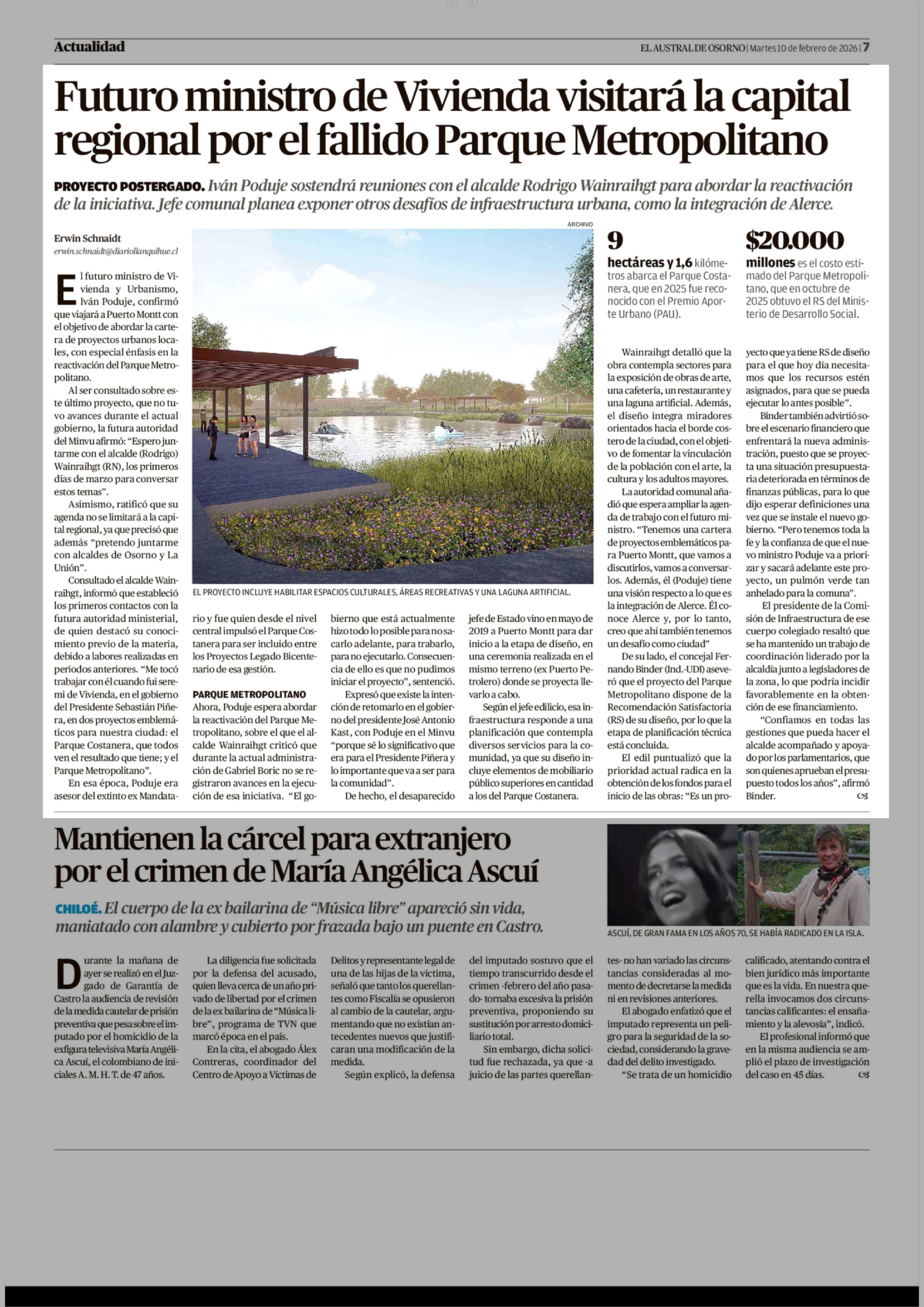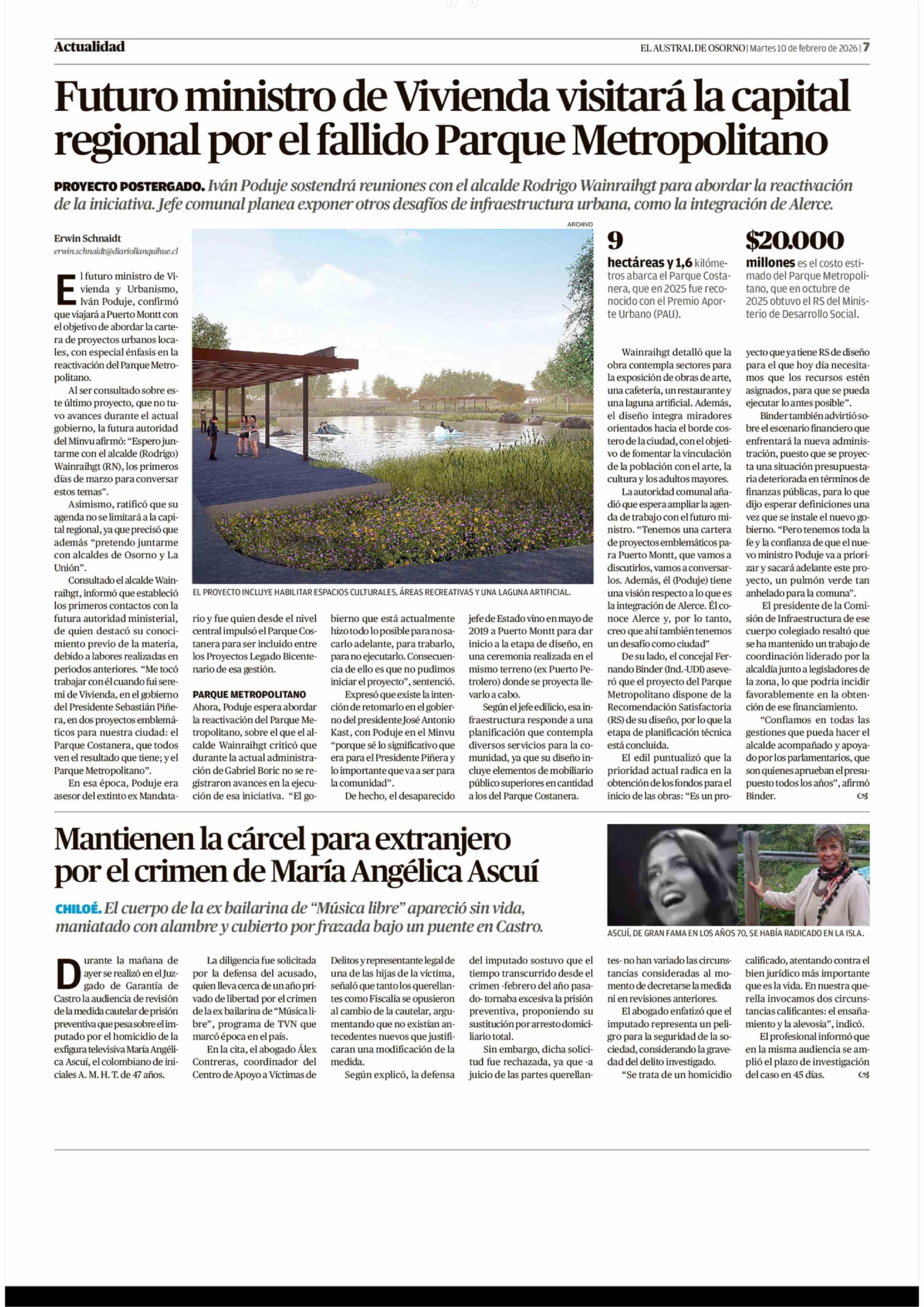 Futuro ministro de Vivienda visitará la capital regional por el fallido Parque Metropolitano 10-02-2026 El Austral de Osorno |