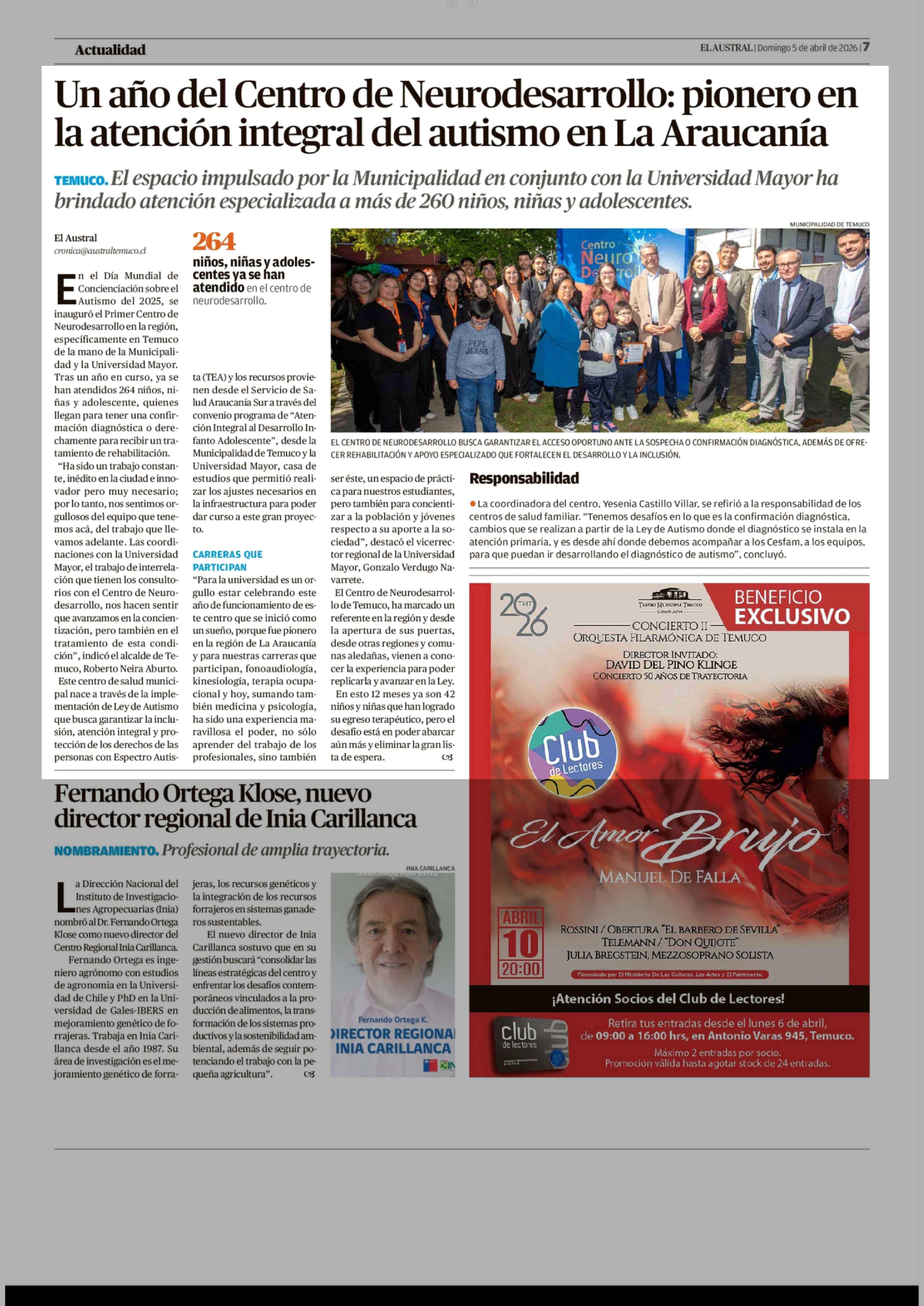 Un año del Centro de Neurodesarrollo: pionero en la atención integral del autismo en La Araucanía 05-04-2026 El Austral de la Araucanía |