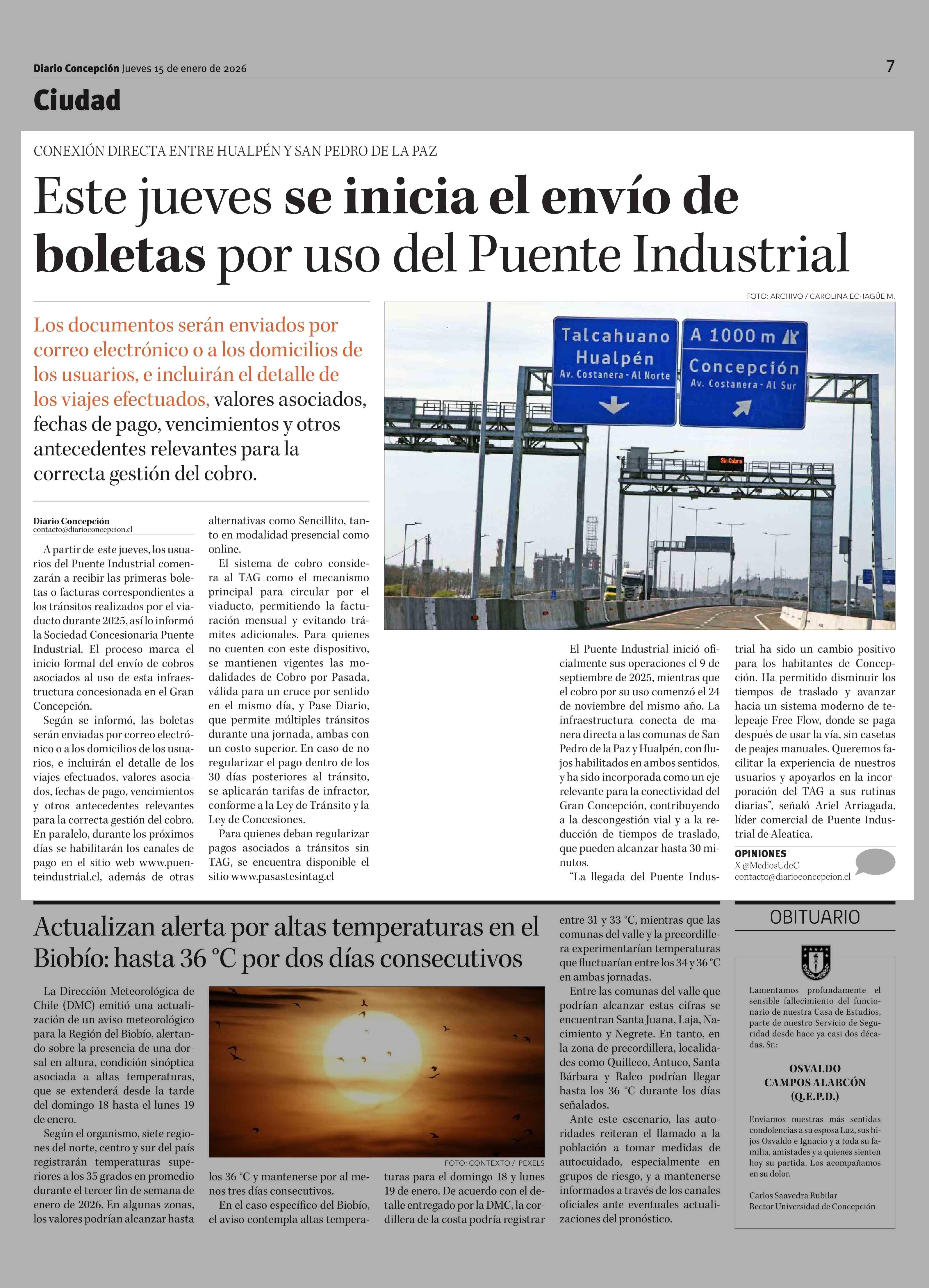 Este jueves se inicia el envío de boletas por uso del Puente Industrial 15-01-2026 Diario Concepción |