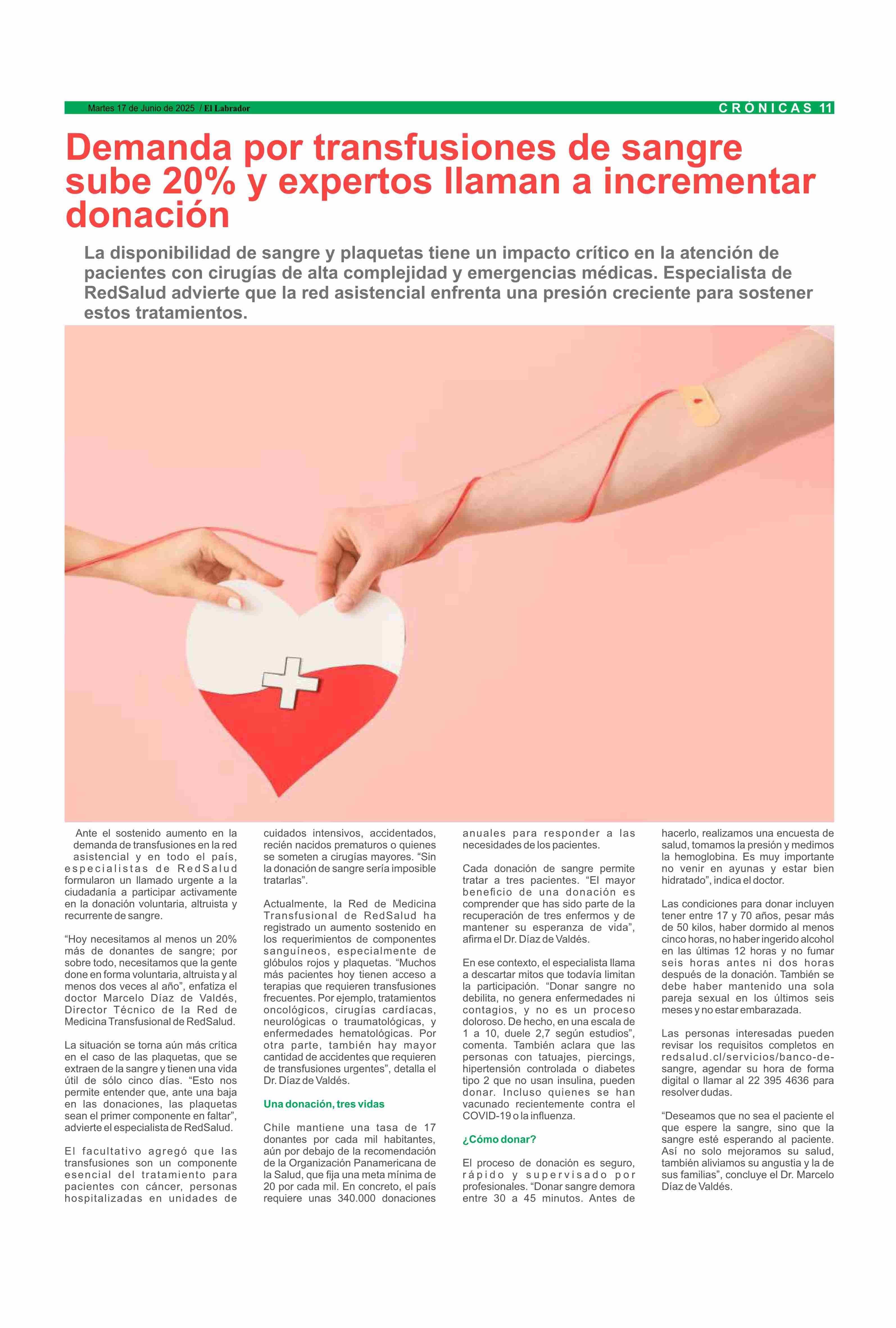 Demanda por transfusiones de sangre sube 20% y expertos llaman a incrementar donación 17-06-2025 El Labrador |