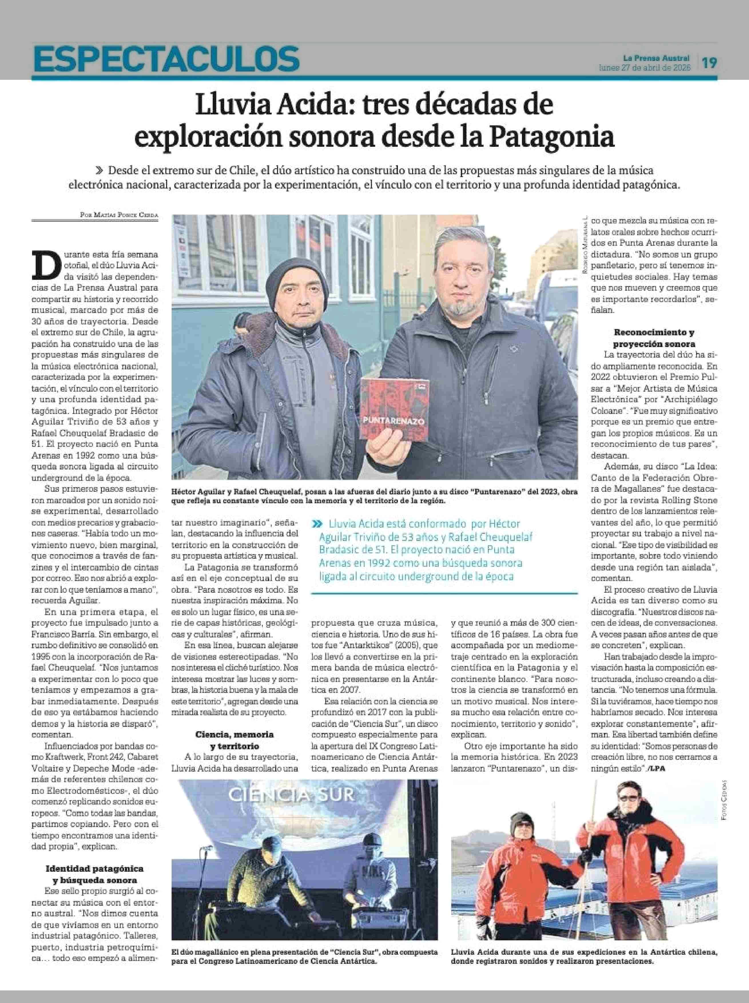 Lluvia Acida: tres décadas de exploración sonora desde la Patagonia 27-04-2026 La Prensa Austral |