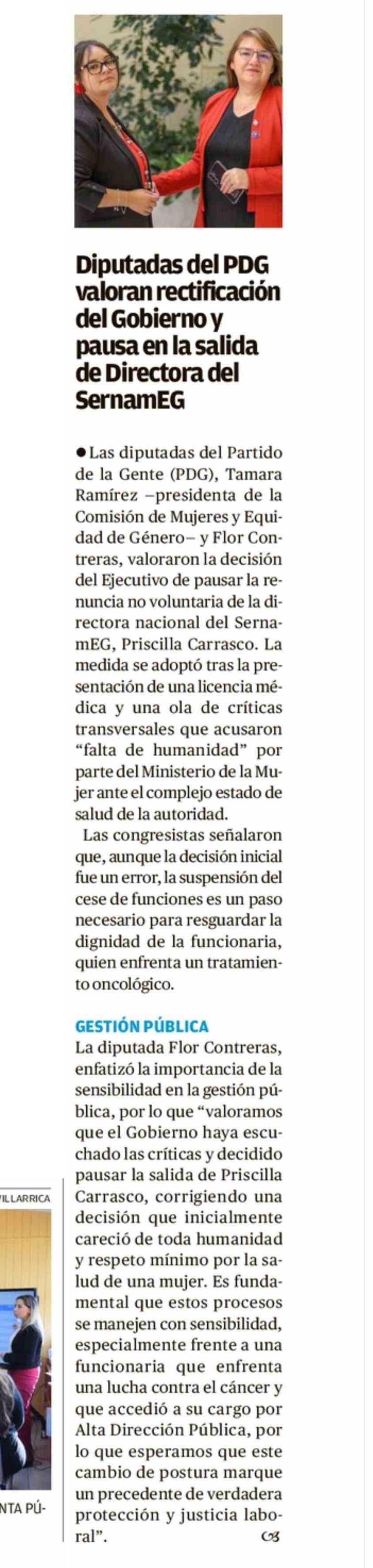 Título: Diputadas del PDG valoran rectificación del Gobierno y pausa en la salida de Directora del SernamEG