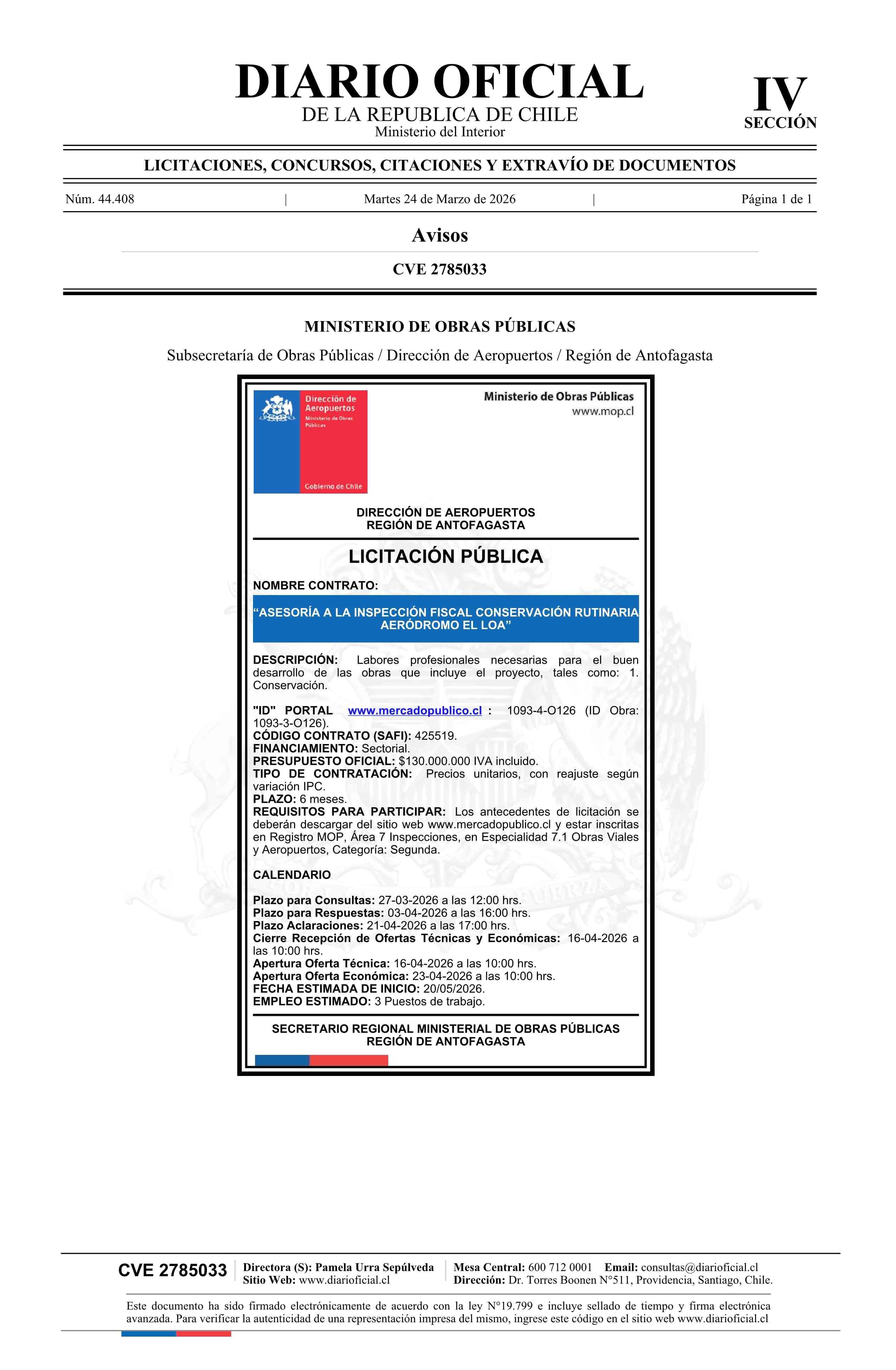 AVISO LICITACIONES: Asesoría a la Inspección Fiscal Conservación Rutinaria Aeródromo El Loa 24-03-2026 Diario Oficial Edición Electrónica |