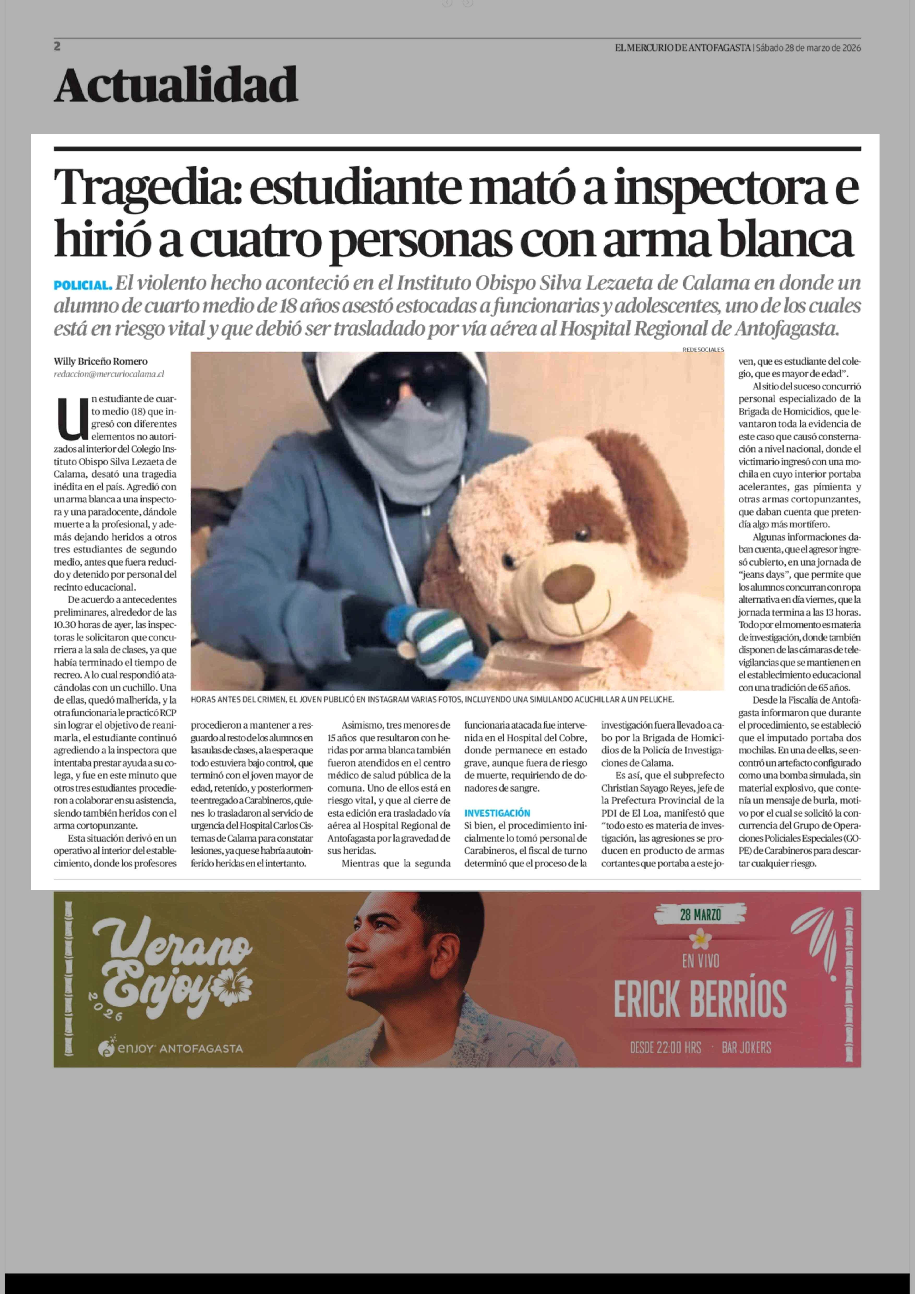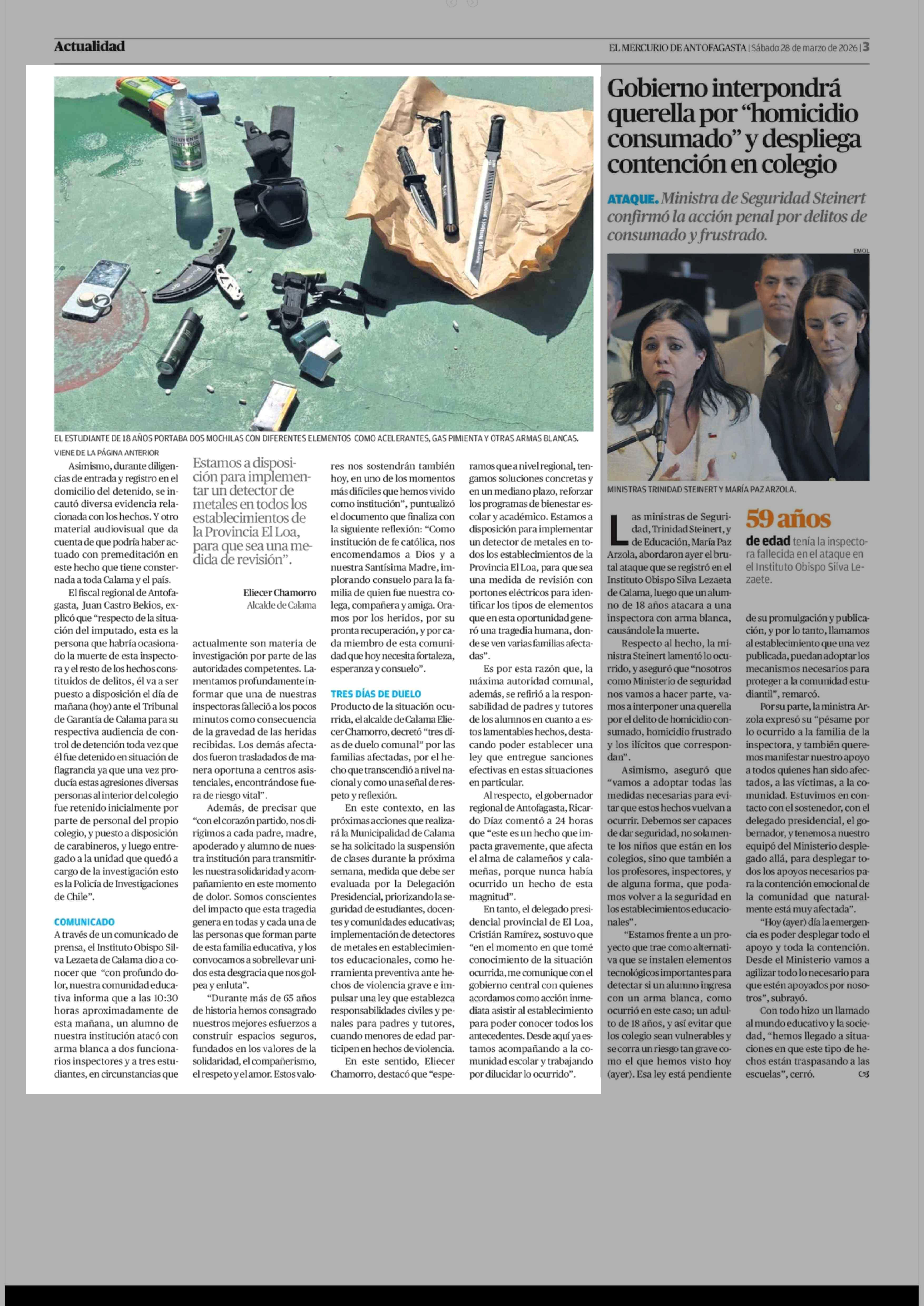 Tragedia: estudiante mató a inspectora e hirió a cuatro personas con arma blanca 28-03-2026 El Mercurio de Antofagasta |