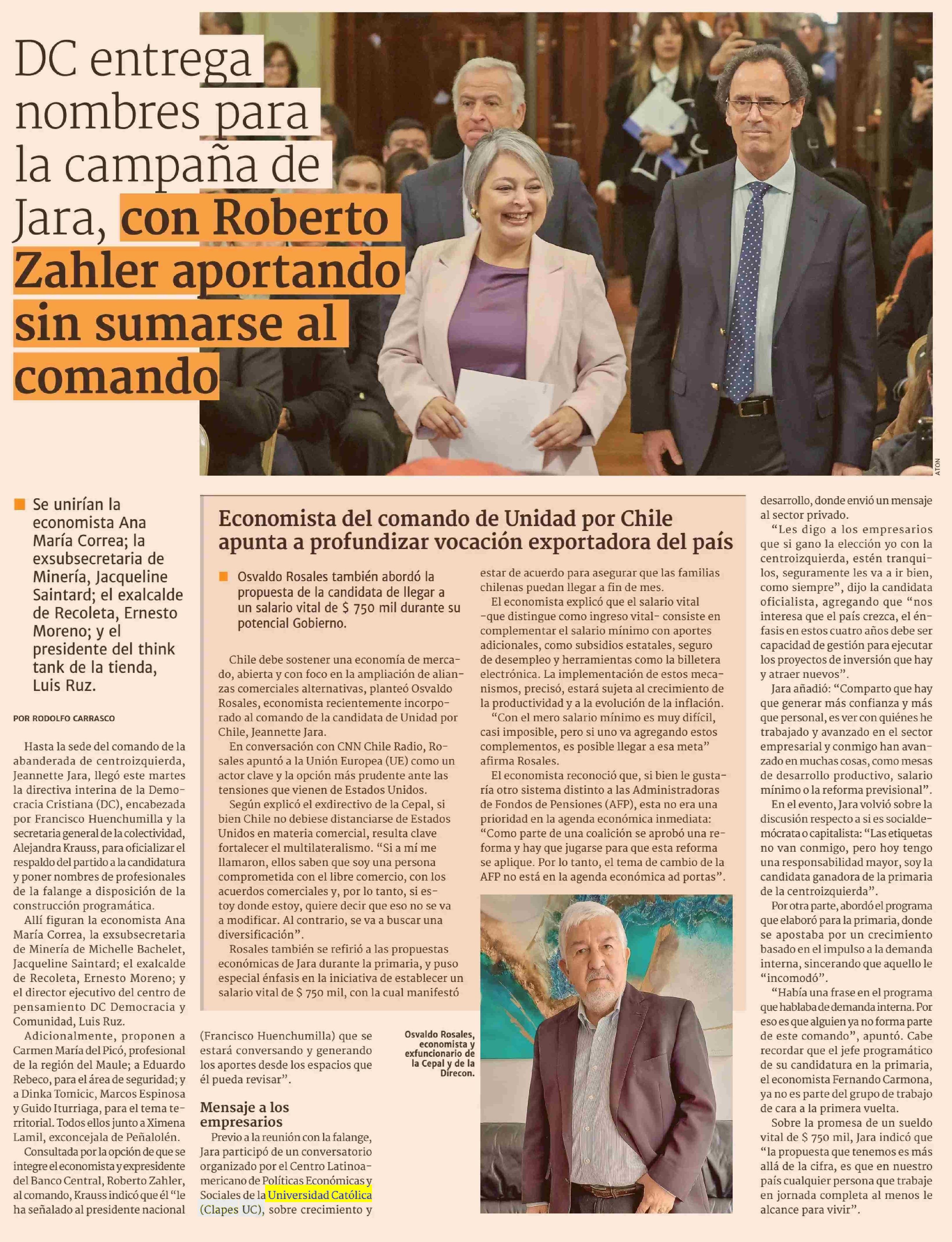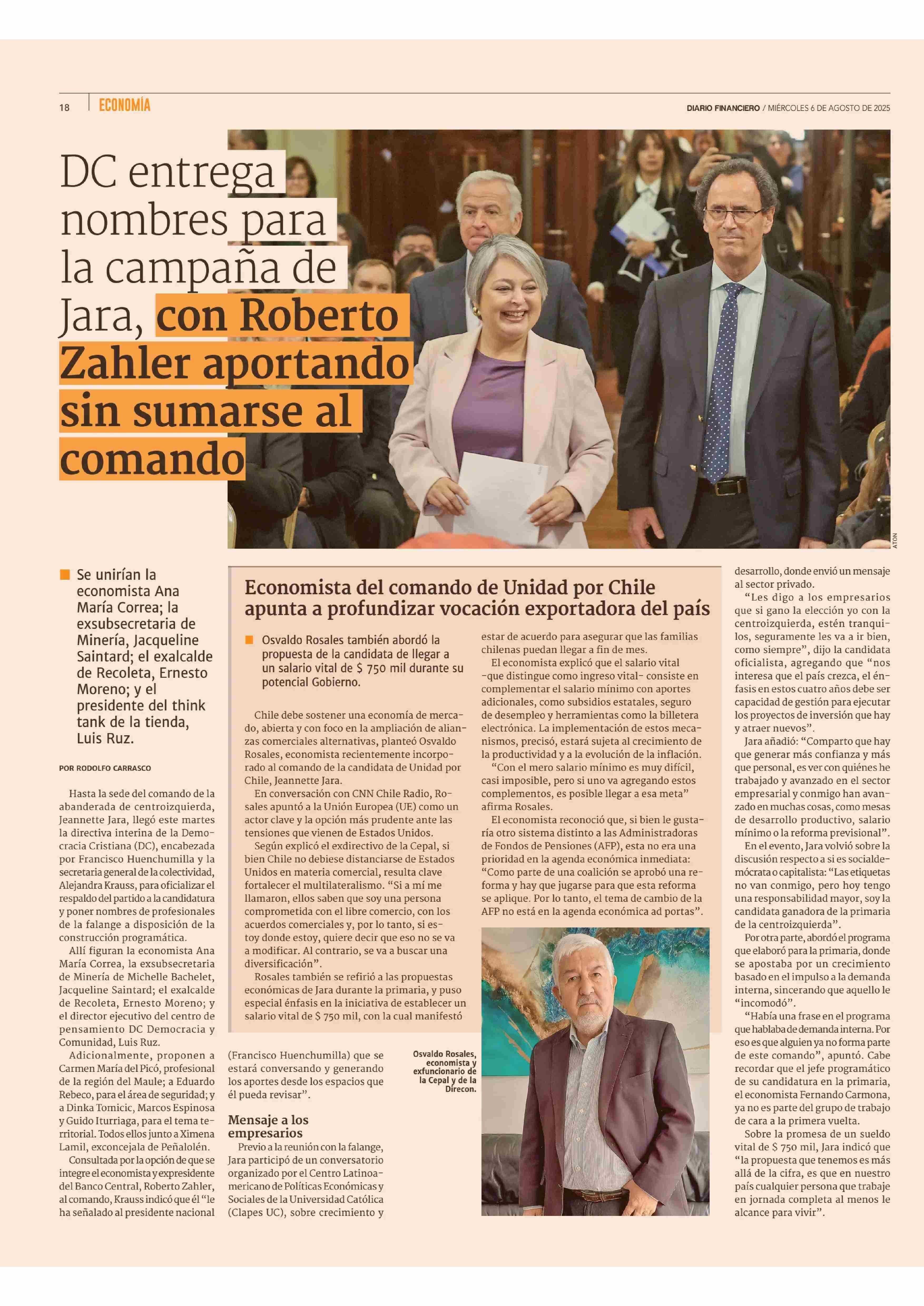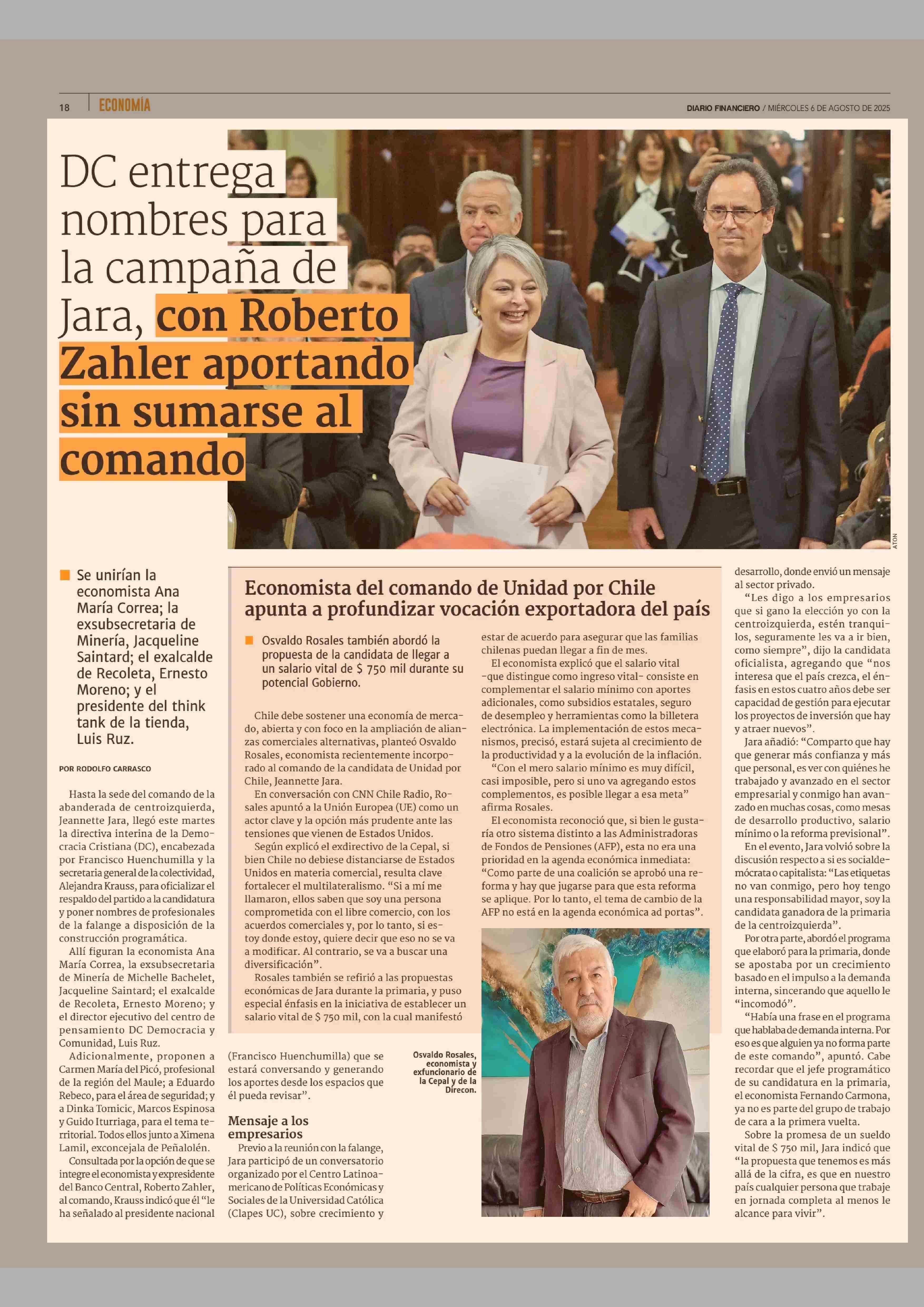 DC entrega nombres para la campaña de Jara, con Roberto Zahler aportando sin sumarse al comando 06-08-2025 Diario Financiero |