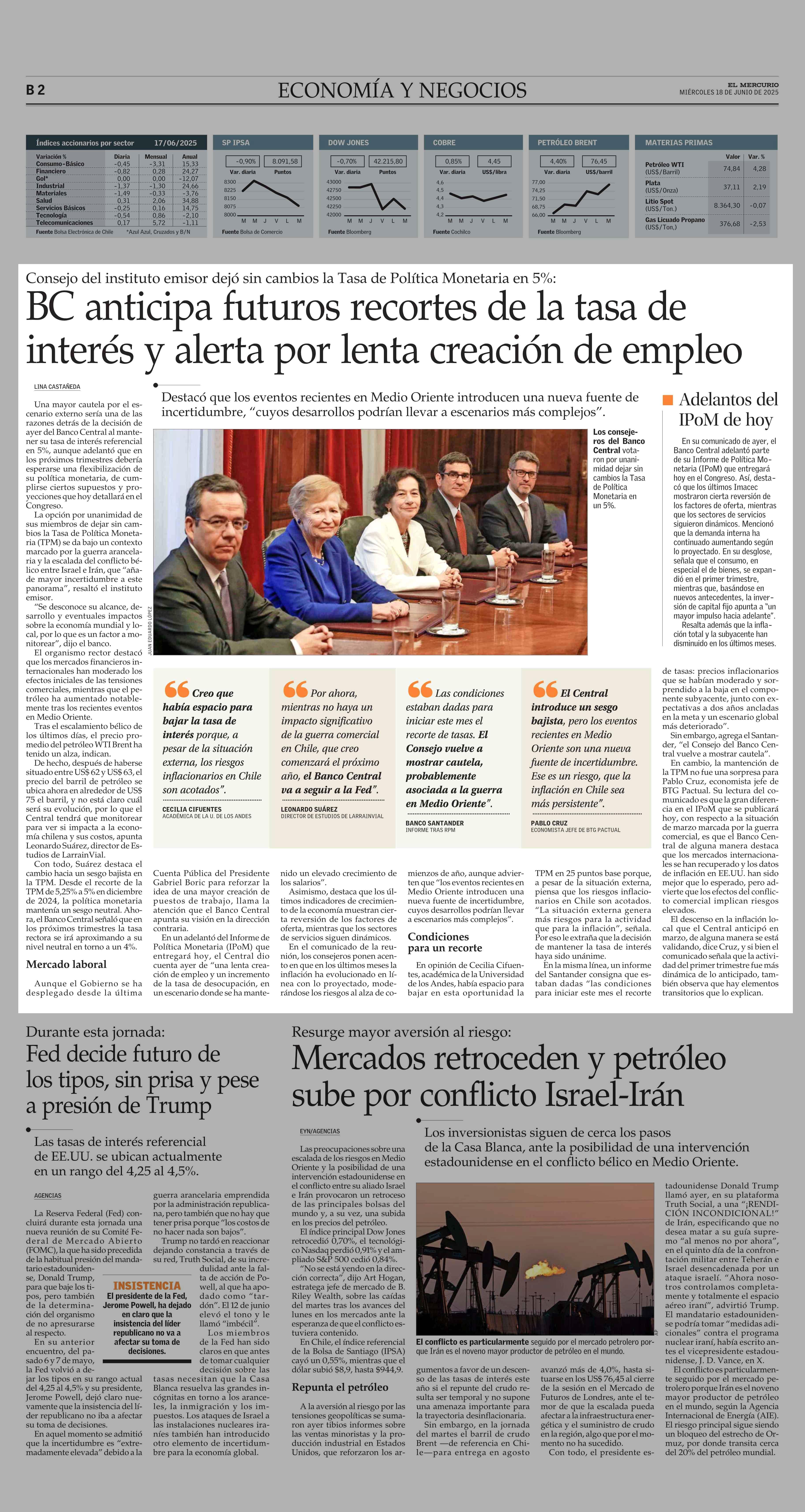 BC anticipa futuros recortes de la tasa de interés y alerta por lenta creación de empleo 18-06-2025 El Mercurio |