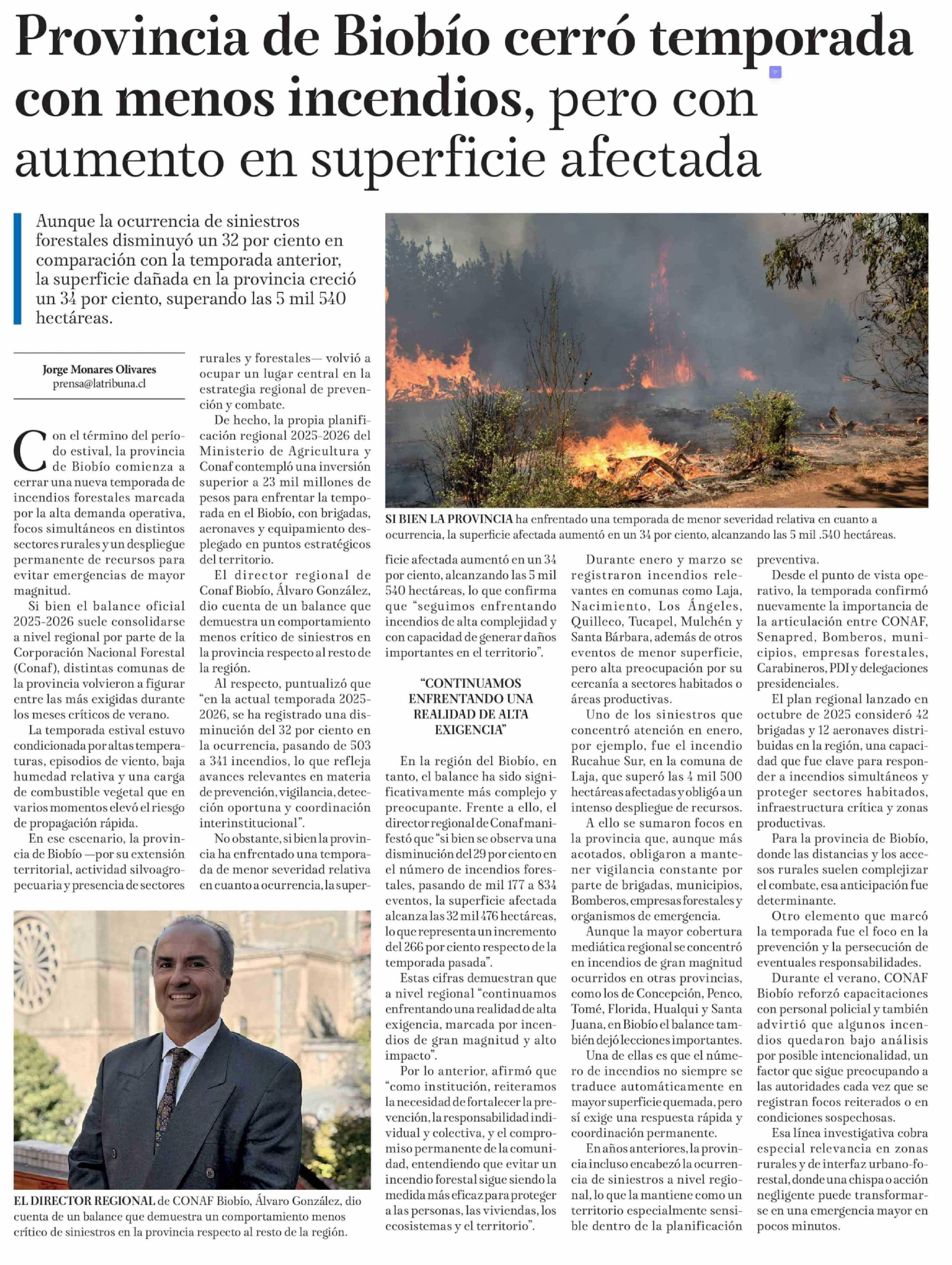 Provincia de Biobío cerró temporada con menos incendios, pero con aumento en superficie afectada 08-04-2026 La Tribuna |