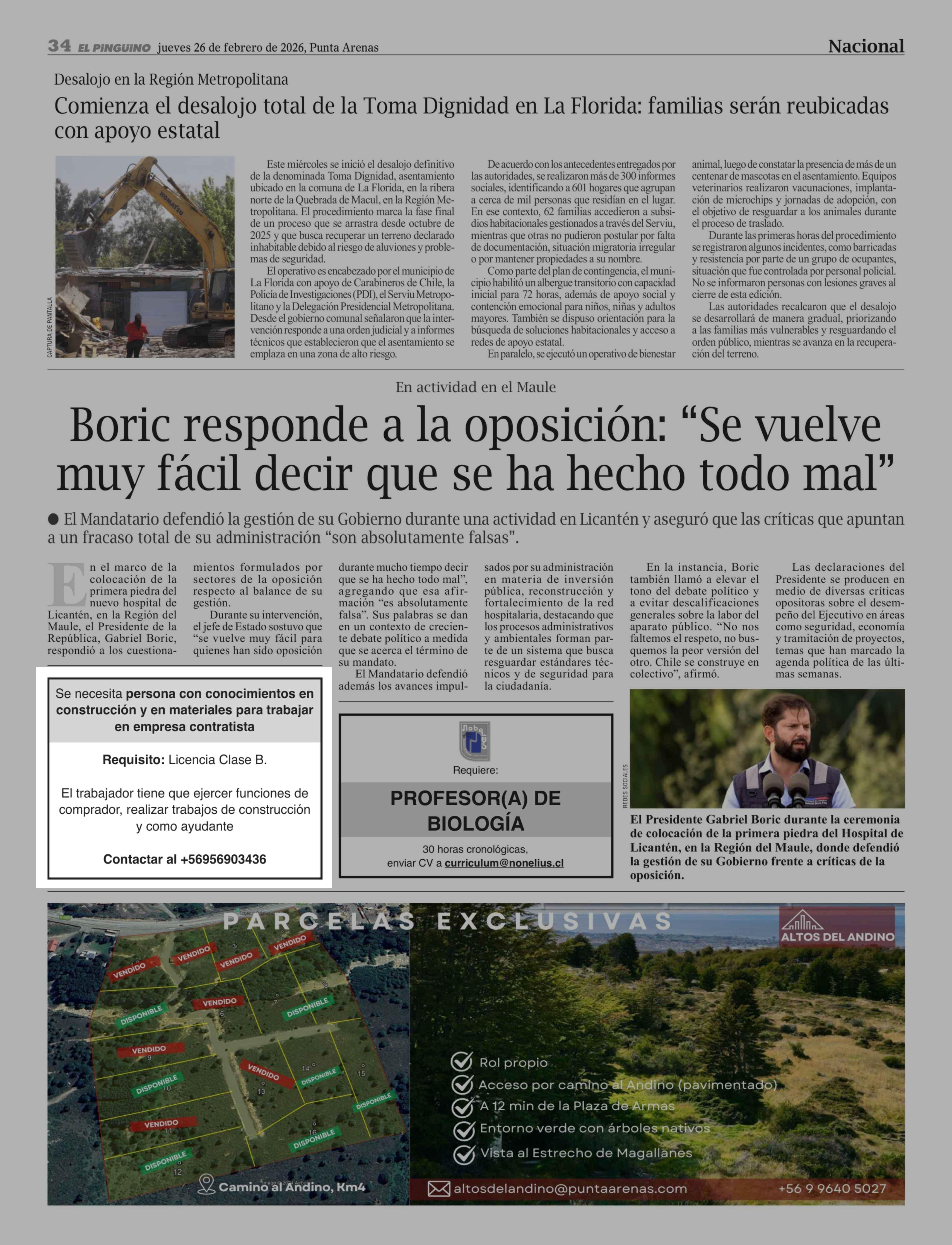Aviso Empleo: Se necesita persona con conocimientos en construcción y en materiales para trabajar en empresa contratista 26-02-2026 El Pingüino |