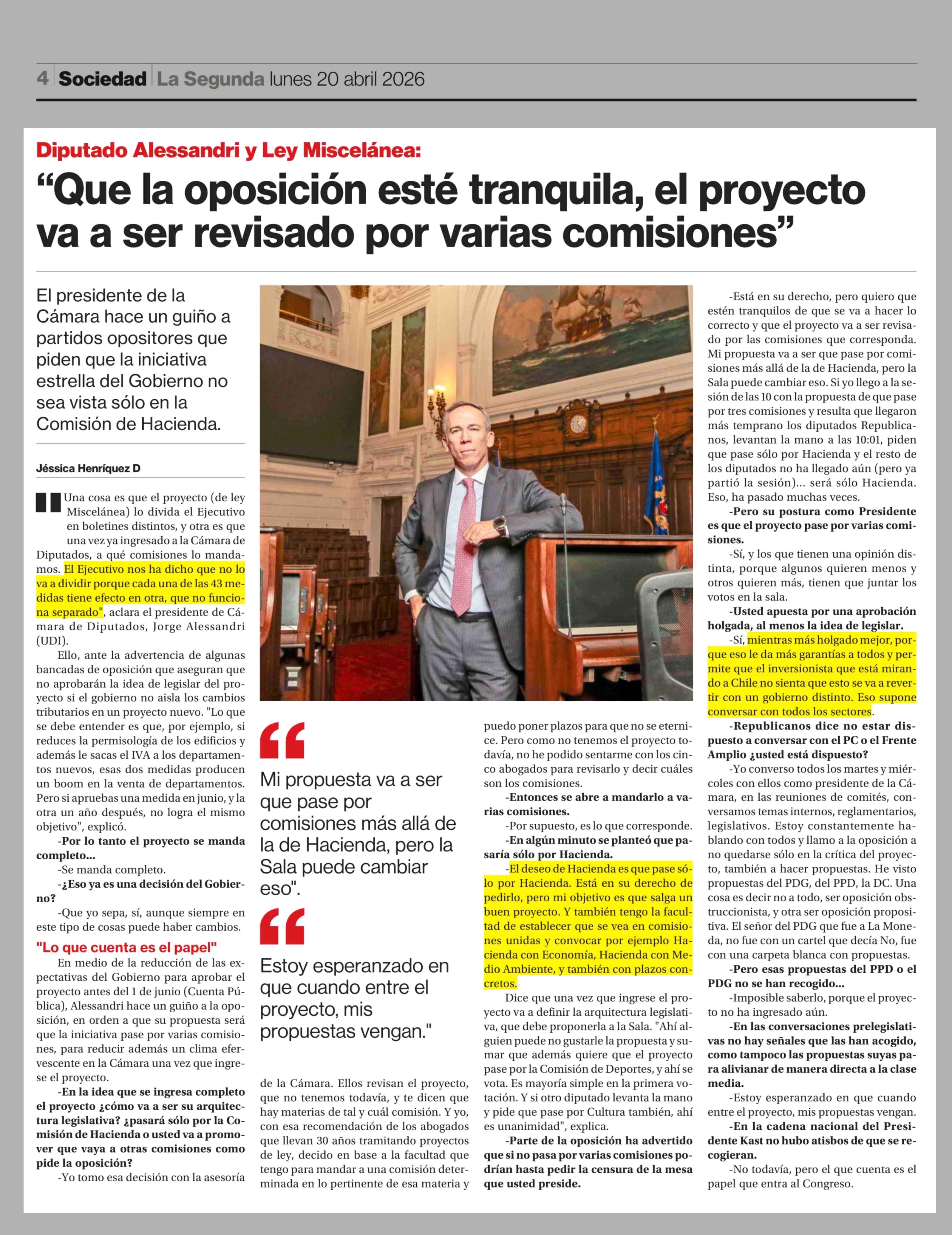"Que la oposición esté tranquila, el proyecto va a ser revisado por varias comisiones" 20-04-2026 La Segunda |