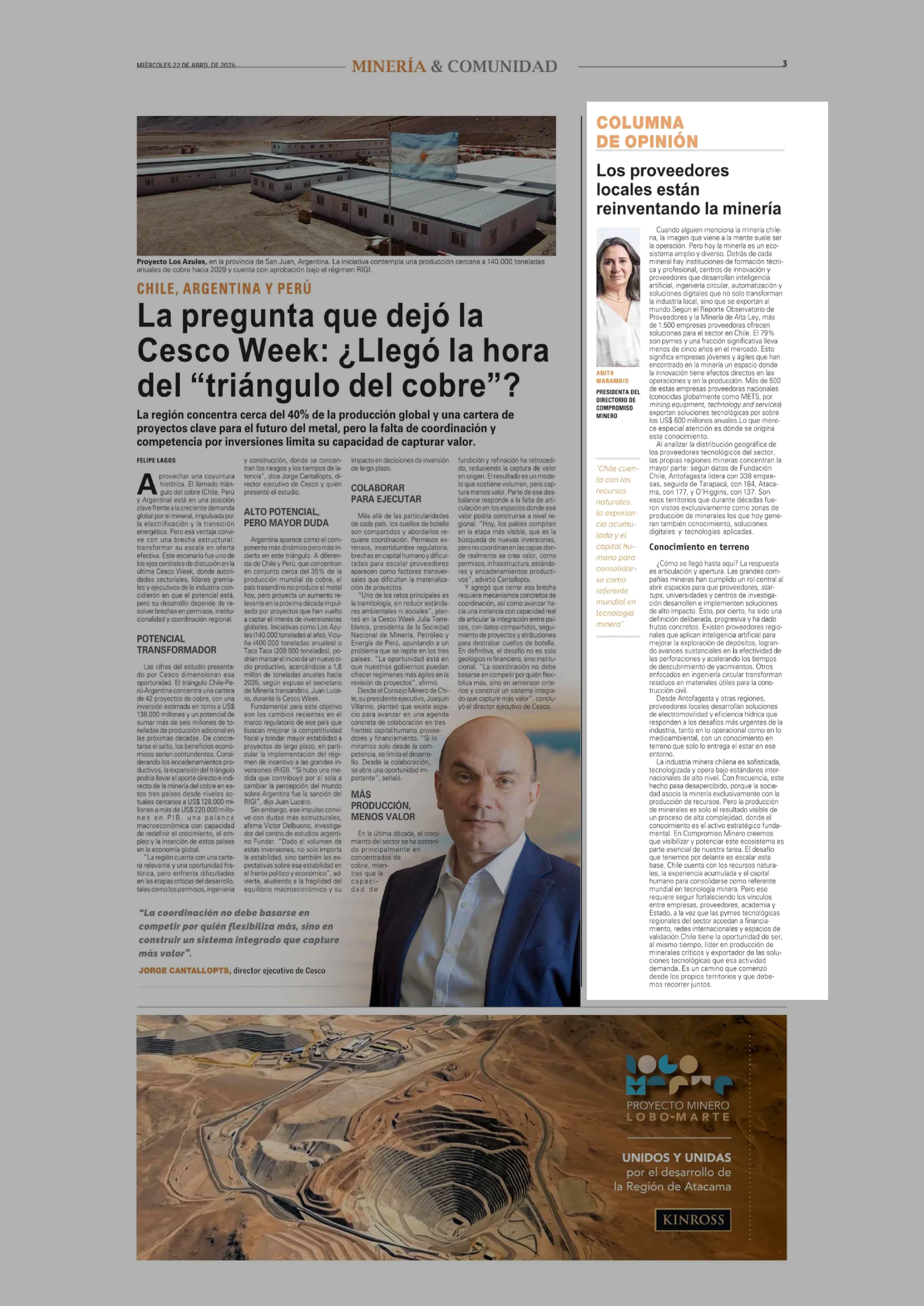 COLUMNAS DE OPINIÓN: Los proveedores locales están reinventando la minería 22-04-2026 El Mercurio |
