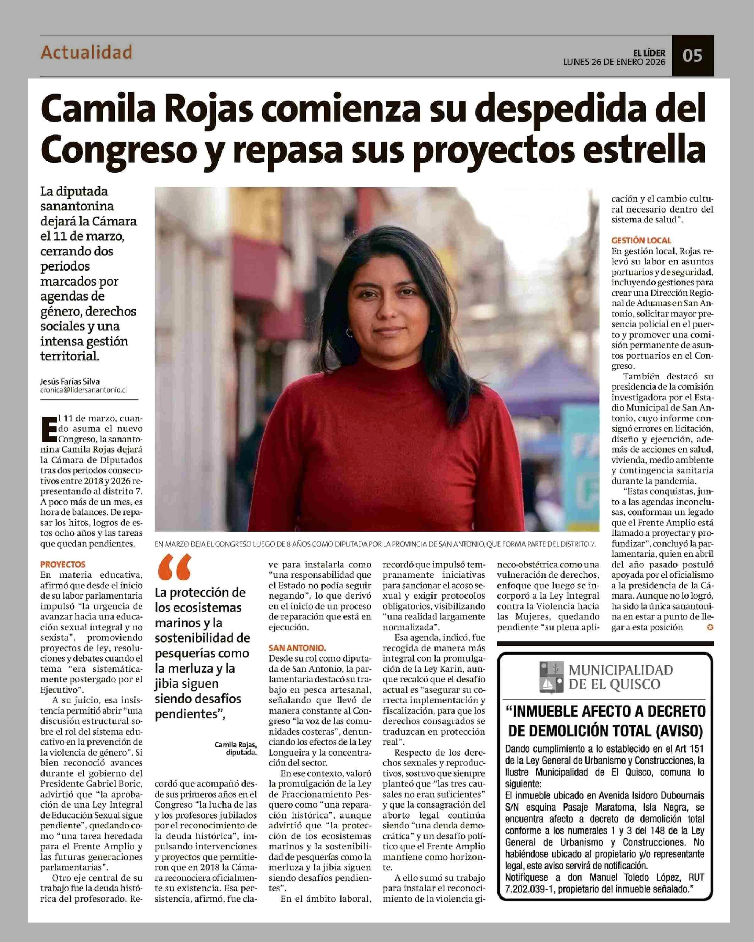Camila Rojas comienza su despedida del Congreso y repasa sus proyectos estrella 26-01-2026 El Líder |