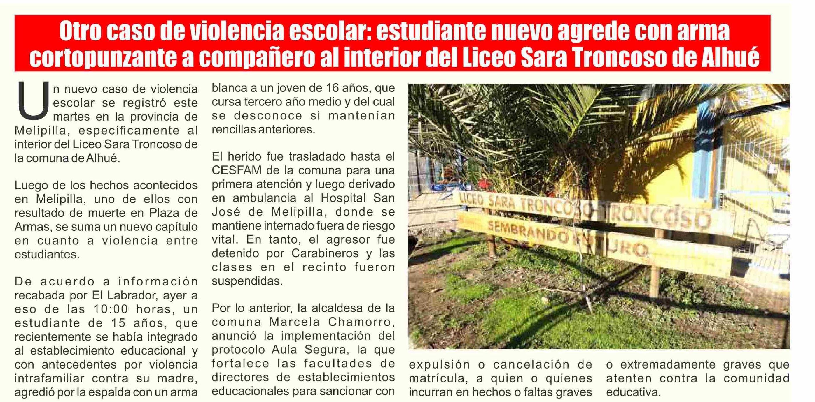 Otro caso de violencia escolar: estudiante nuevo agrede con arma cortopunzante a compañero al interior del Liceo Sara Troncoso de Alhué 18-06-2025 El Labrador |