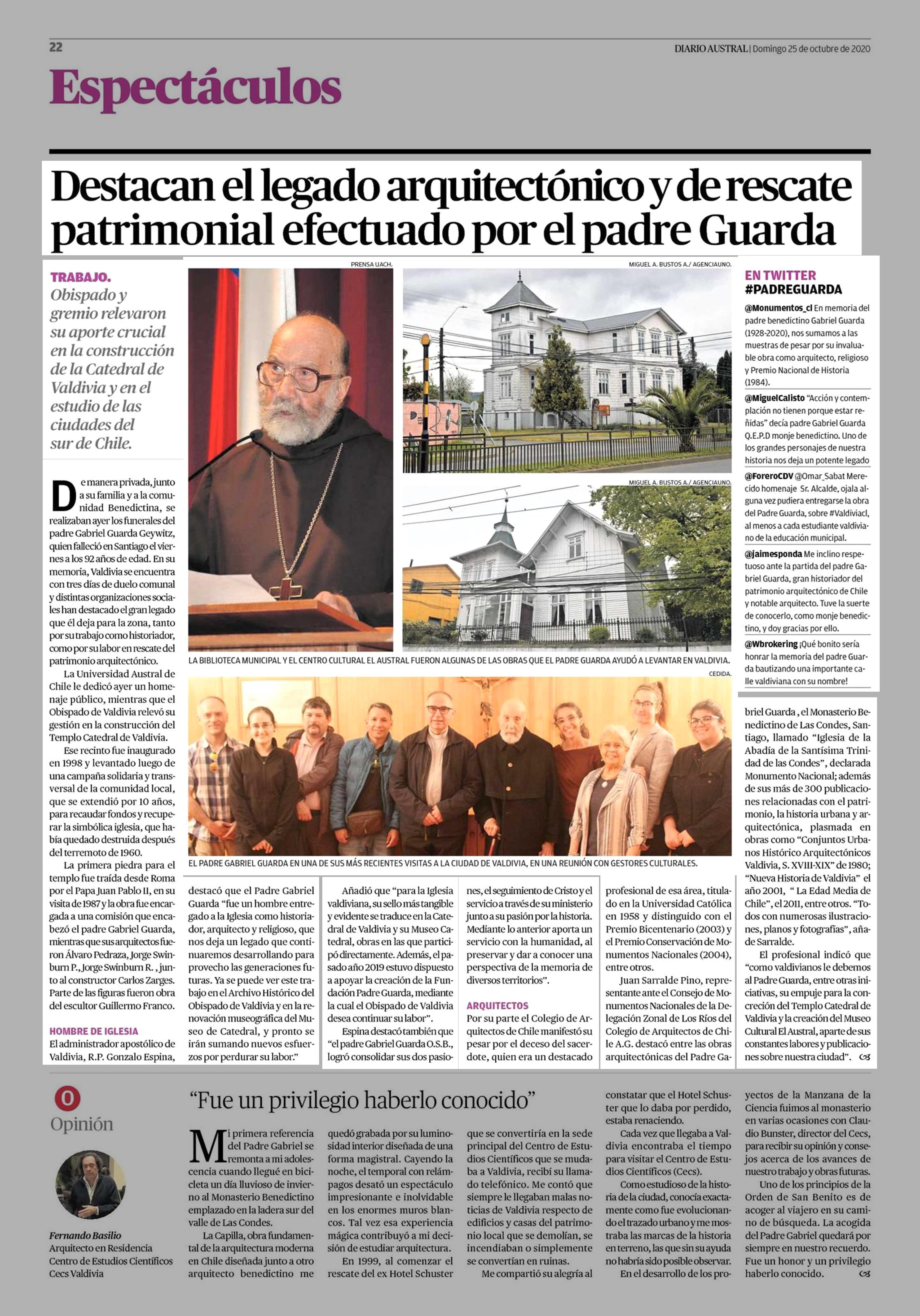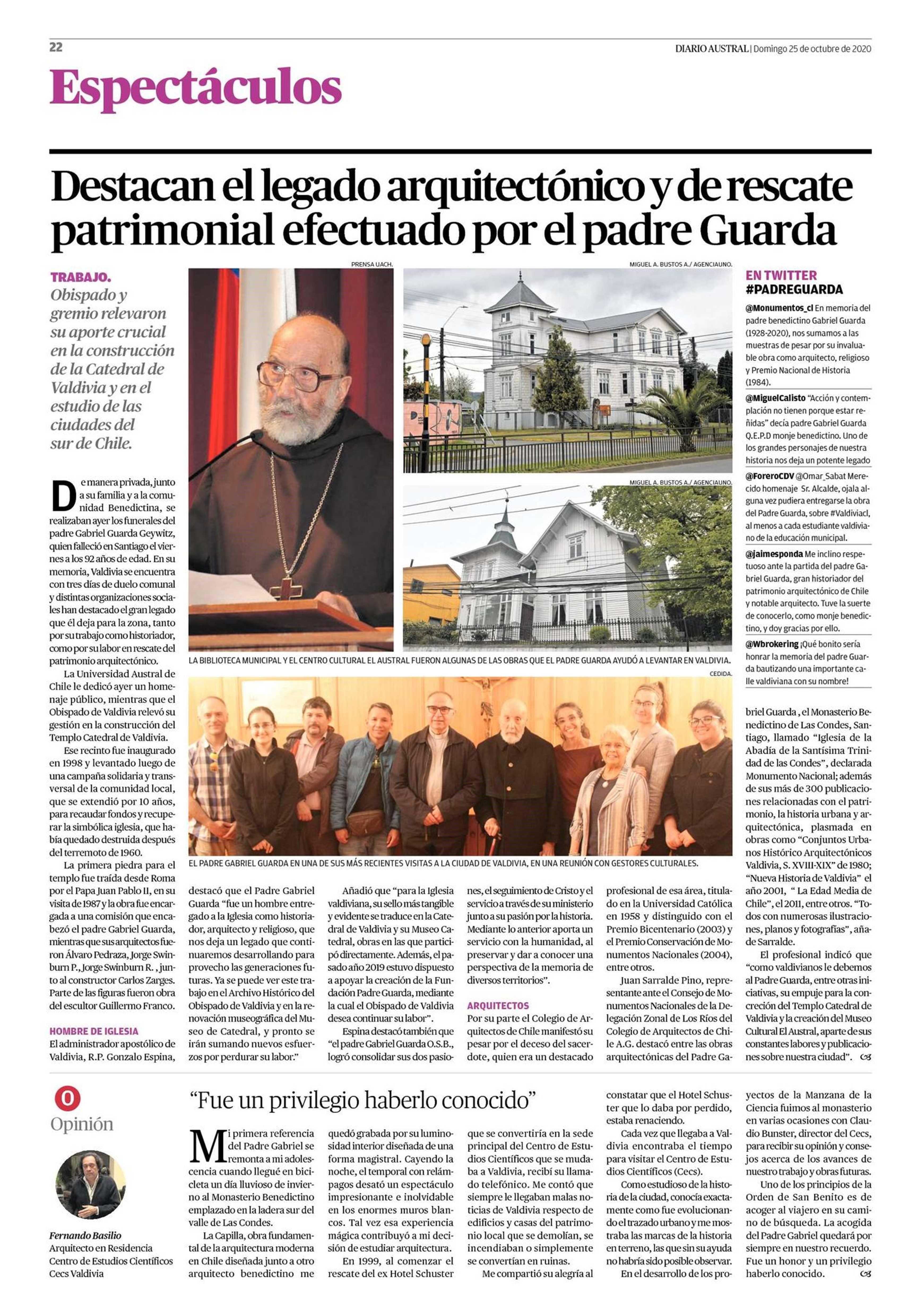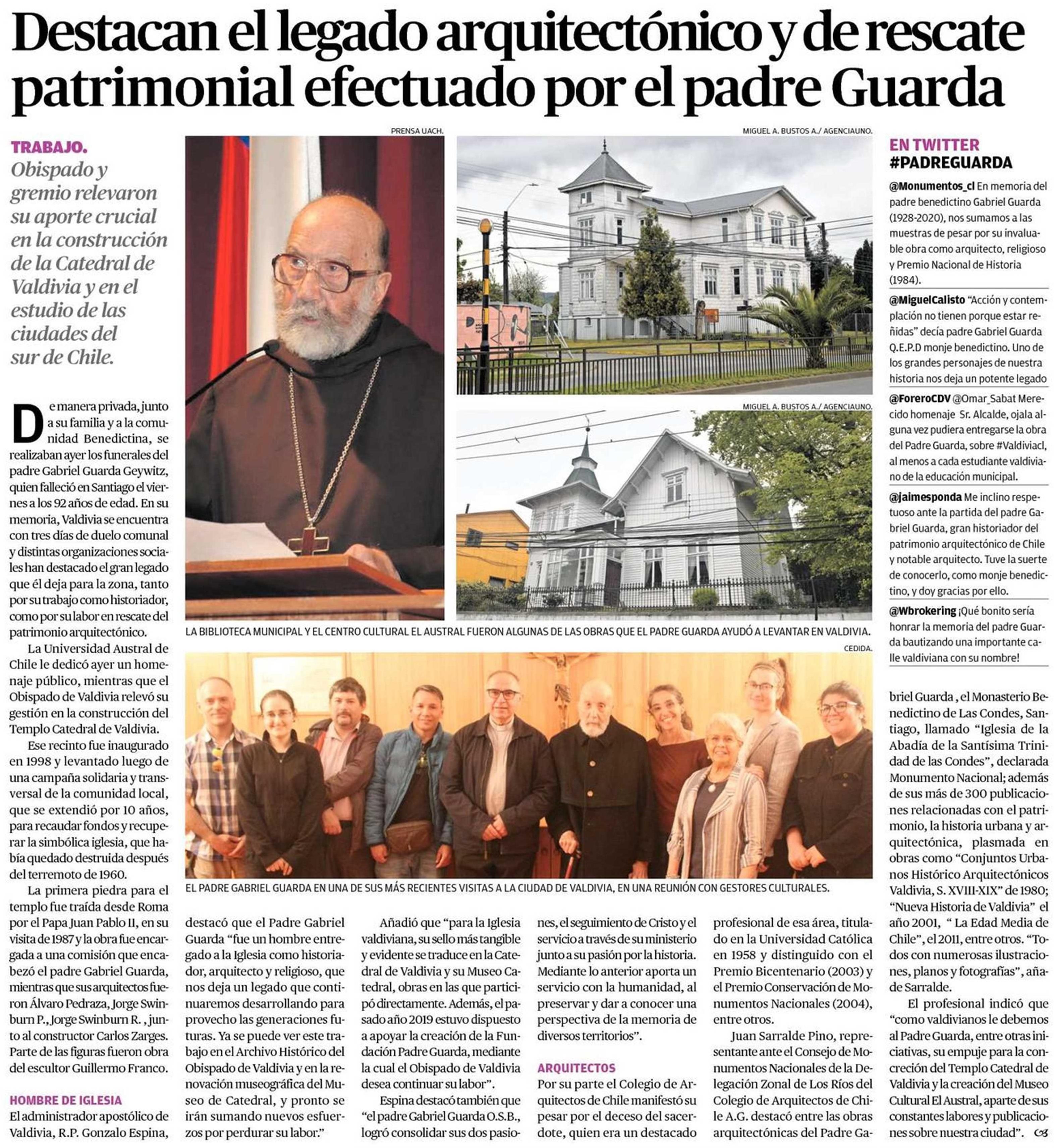Destacan el legado arquitectónico y de rescate patrimonial efectuado por el padre Guarda 25-10-2020 Diario Austral Región de Los Ríos |
