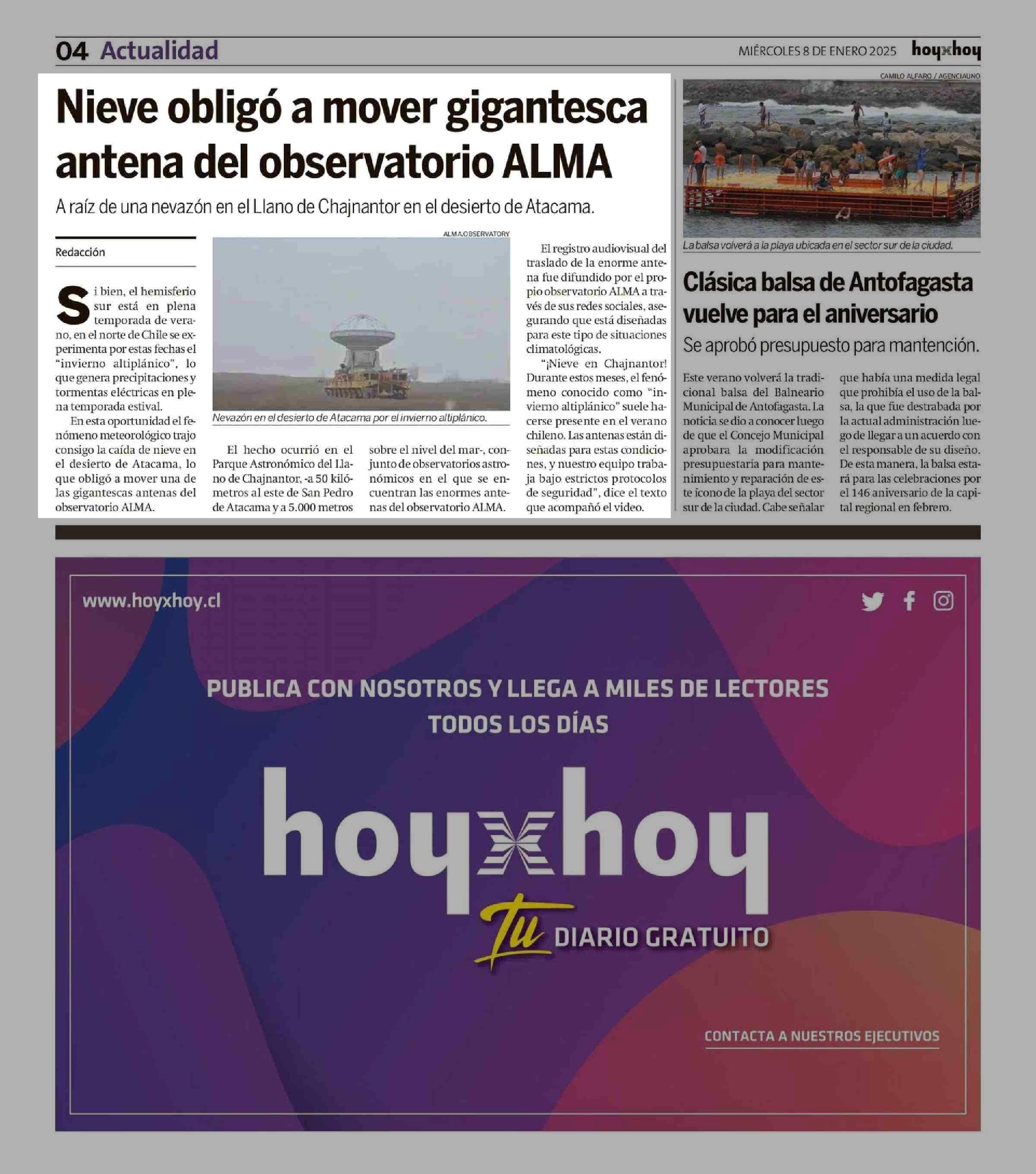 Nieve obligó a mover gigantesca antena del observatorio ALMA 08-01-2025 Hoy x Hoy Antofagasta |