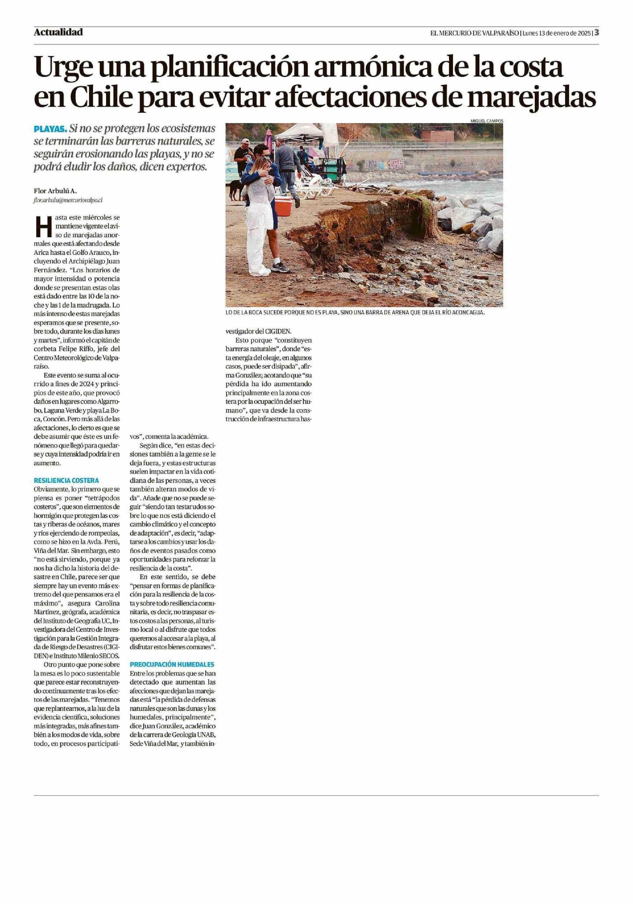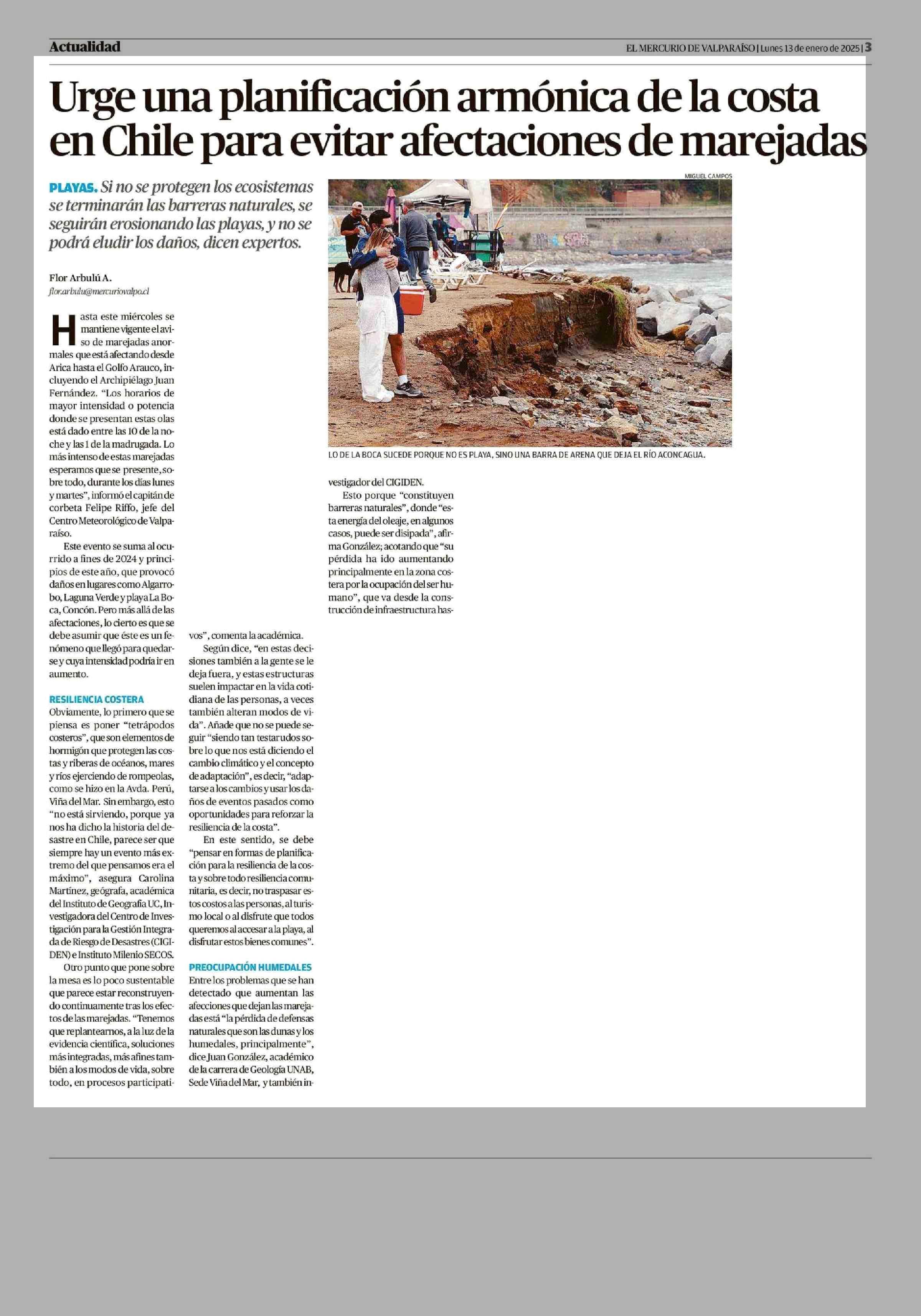 Urge una planificación armónica de la costa en Chile para evitar afectaciones de marejadas 13-01-2025 El Mercurio de Valparaíso |
