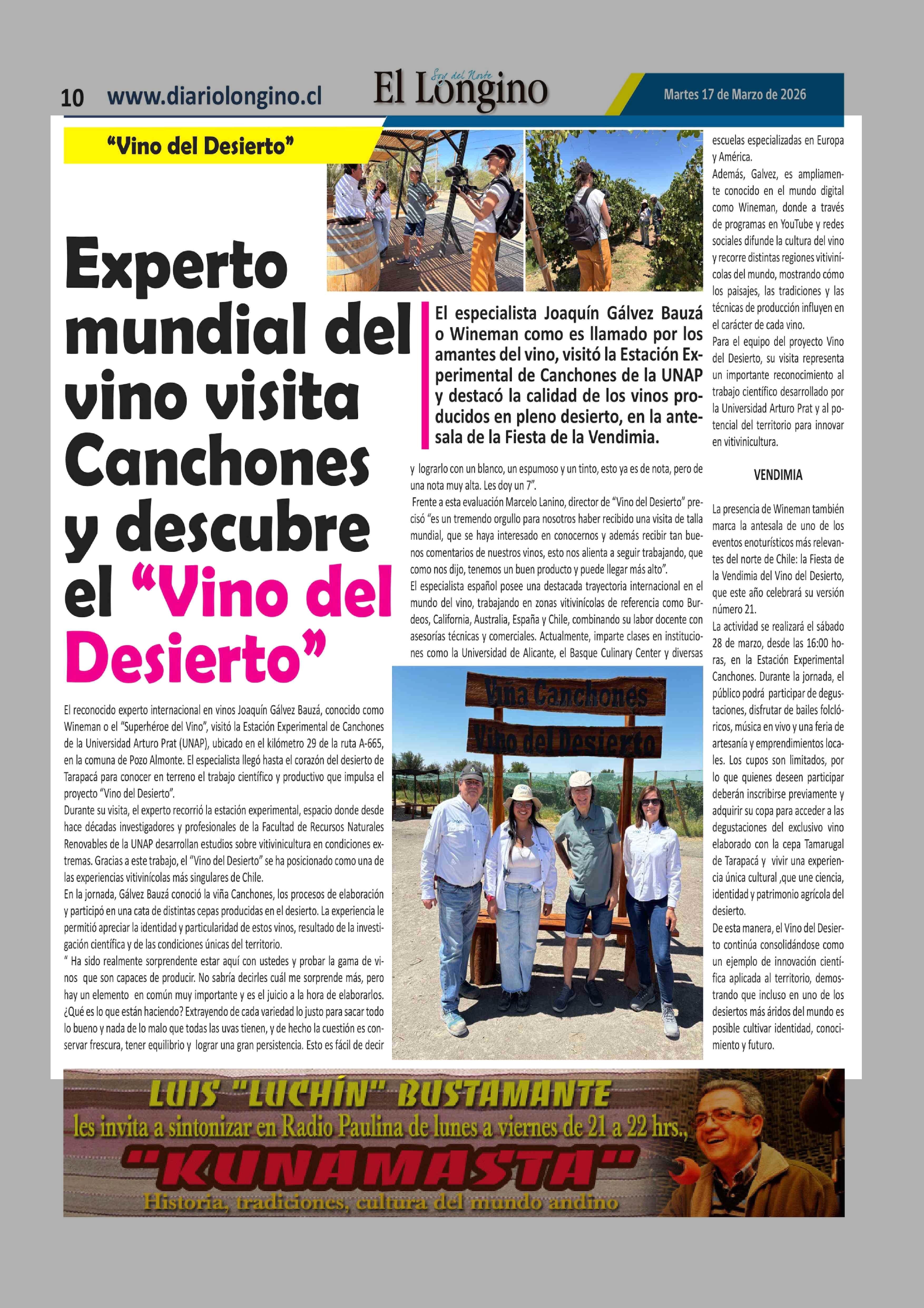 Experto mundial del vino visita Canchones y descubre el "Vino del Desierto 17-03-2026 El Longino |