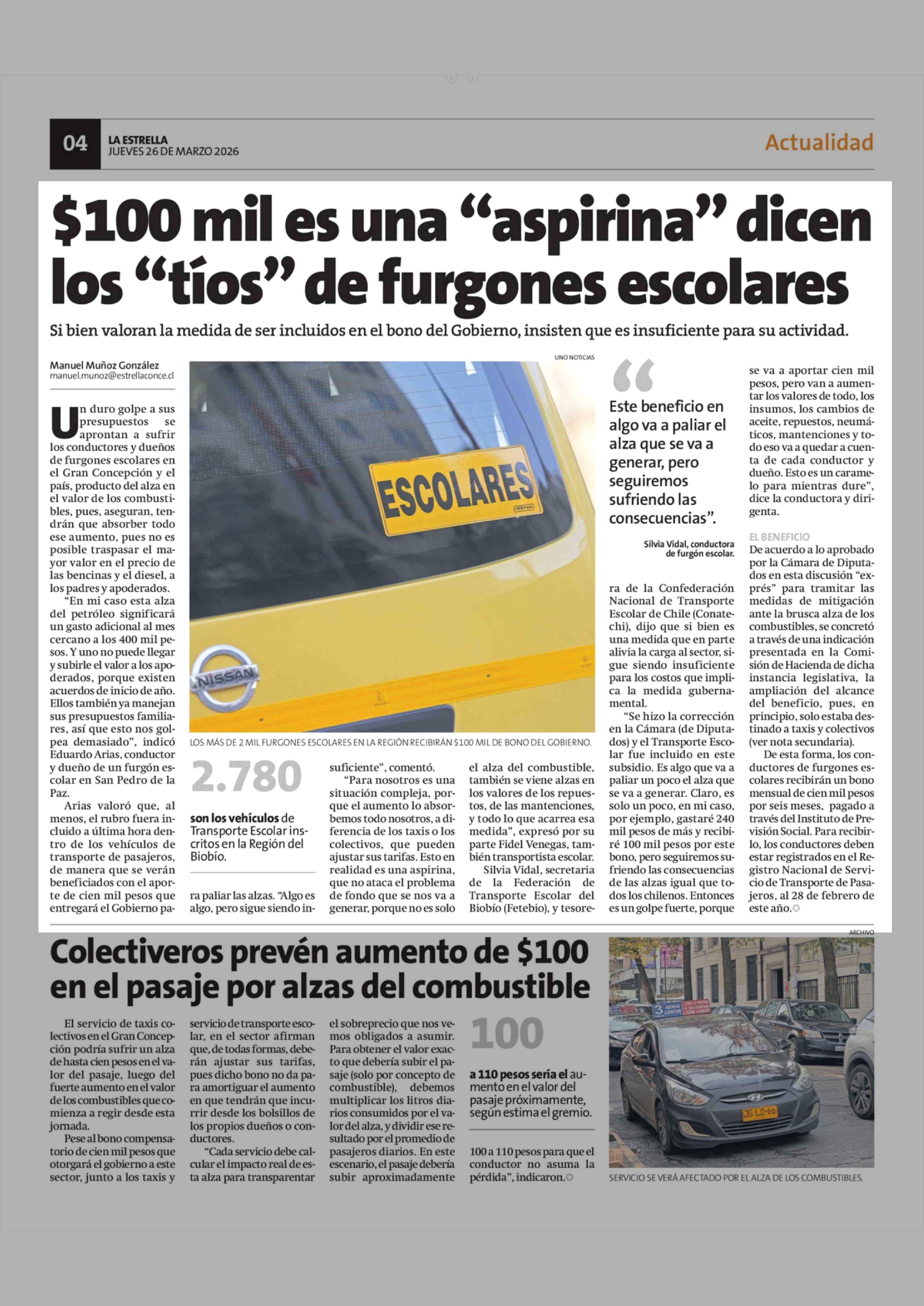 $100 Mil es una "aspirina" dicen los "tíos" de furgones escolares 26-03-2026 La Estrella de Concepción |